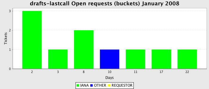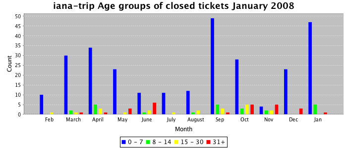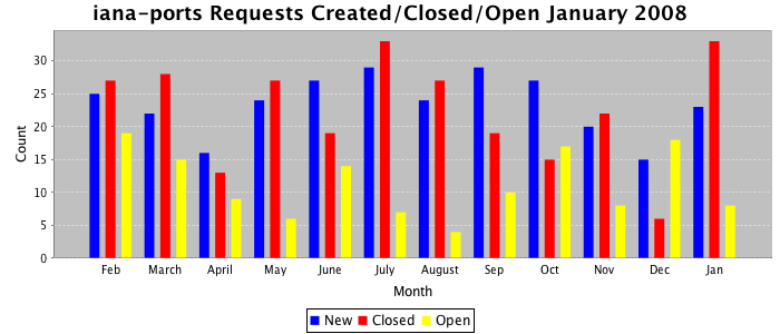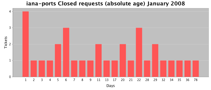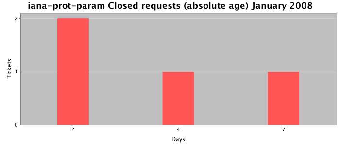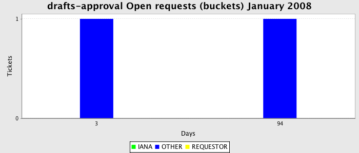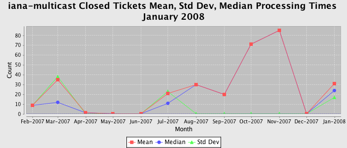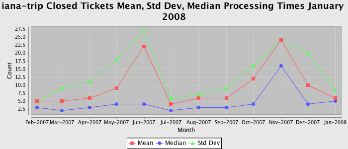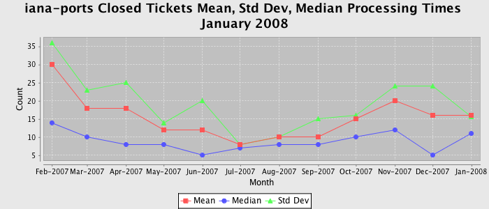 January 2008Due to the nature of resource request reviews, ICANN/IANA and the IETF community are jointly responsible for cooperatively managing the resource request process. ICANN/IANA has control over the functions it performs directly, e.g., receiving requests, making sure they are syntactically and semantically sensible, forwarding the requests to Designated Experts where appropriate, creating and modifying the registries, etc. The IETF community has direct or indirect control over functions performed by third parties, including IESG Designated Experts, the IESG, the IAB, the RFC Editor, and the requester. As such, the processing of requests has a “gross processing time” calendar days goal established for each function and a “net processing time” calendar days goal to reflect time expended directly by ICANN/IANA.