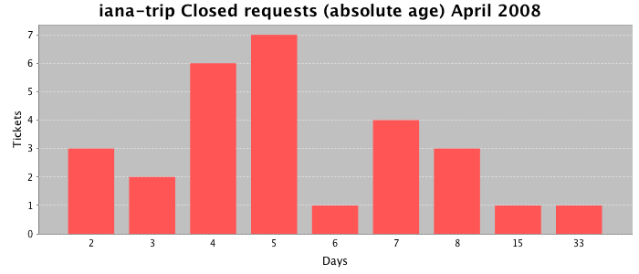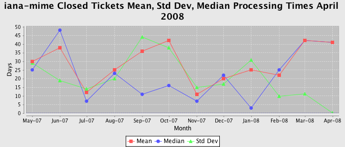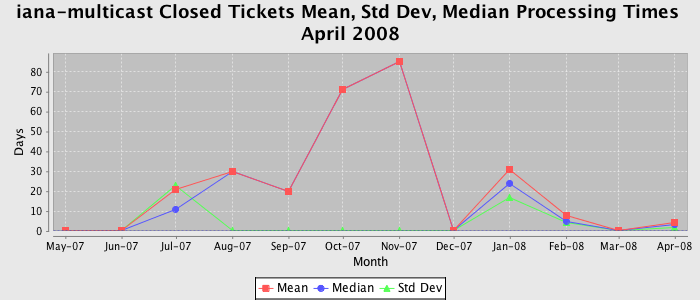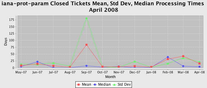 April 2008Due to the nature of resource request reviews, ICANN/IANA and the IETF community are jointly responsible for cooperatively managing the resource request process. ICANN/IANA has control over the functions it performs directly, e.g., receiving requests, making sure they are syntactically and semantically sensible, forwarding the requests to Designated Experts where appropriate, creating and modifying the registries, etc. The IETF community has direct or indirect control over functions performed by third parties, including IESG Designated Experts, the IESG, the IAB, the RFC Editor, and the requester. As such, the processing of requests has a “gross processing time” calendar days goal established for each function and a “net processing time” calendar days goal to reflect time expended directly by ICANN/IANA.