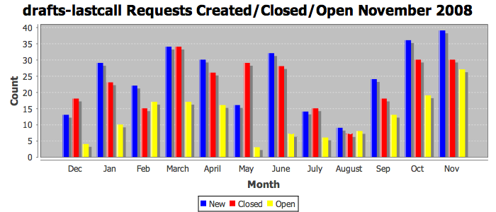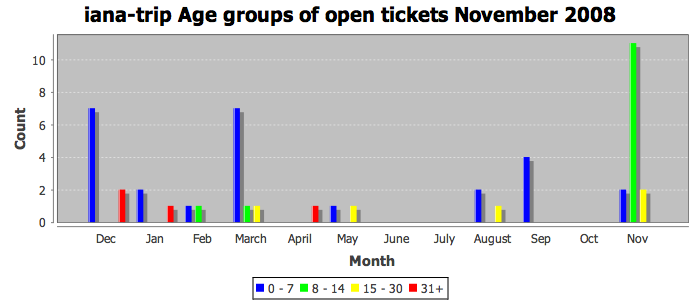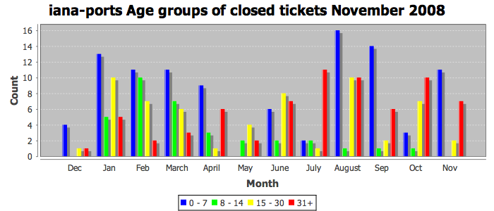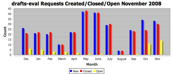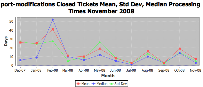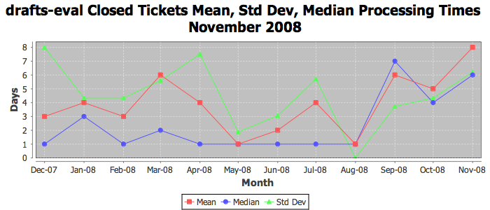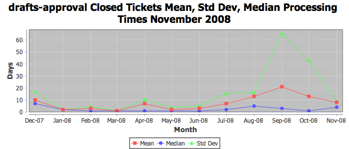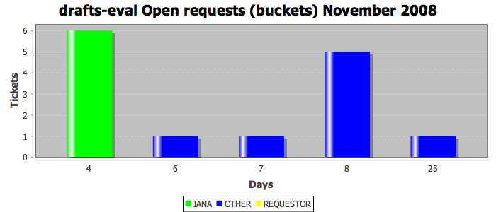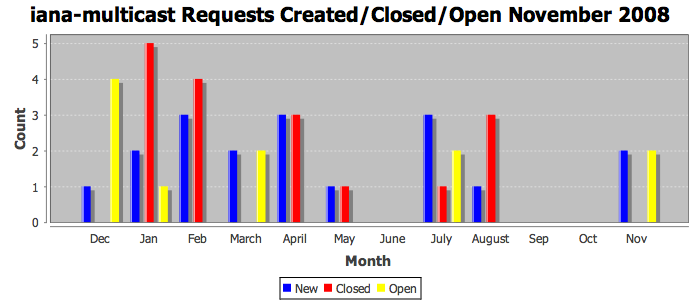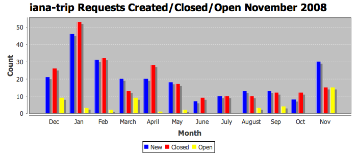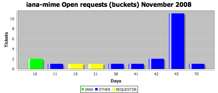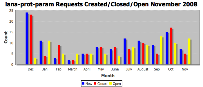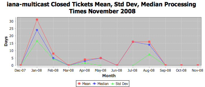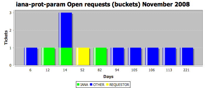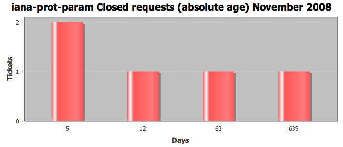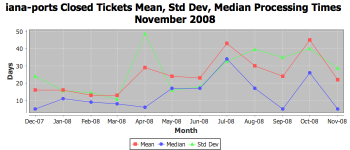 November 2008Due to the nature of resource request reviews, ICANN/IANA and the IETF community are jointly responsible for cooperatively managing the resource request process. ICANN/IANA has control over the functions it performs directly, e.g., receiving requests, making sure they are syntactically and semantically sensible, forwarding the requests to Designated Experts where appropriate, creating and modifying the registries, etc. The IETF community has direct or indirect control over functions performed by third parties, including IESG Designated Experts, the IESG, the IAB, the RFC Editor, and the requester. As such, the processing of requests has a “gross processing time” calendar days goal established for each function and a “net processing time” calendar days goal to reflect time expended directly by ICANN/IANA.