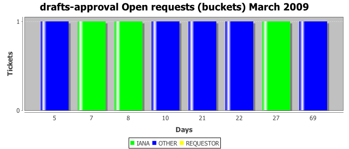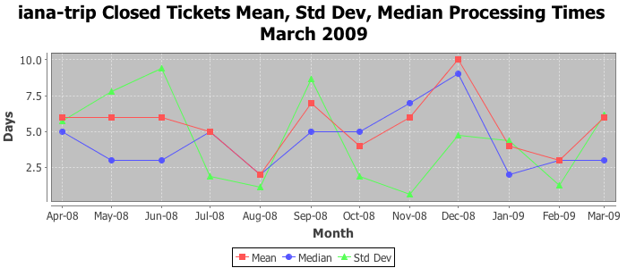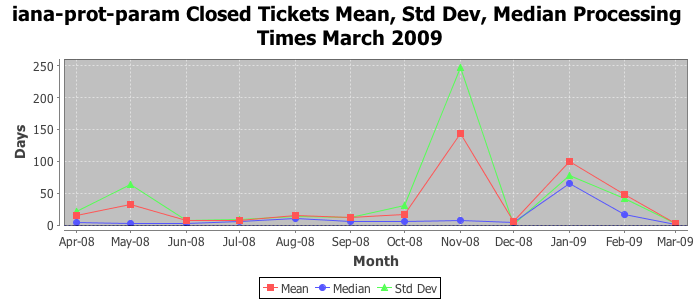 March 2009Due to the nature of resource request reviews, ICANN/IANA and the IETF community are jointly responsible for cooperatively managing the resource request process. ICANN/IANA has control over the functions it performs directly, e.g., receiving requests, making sure they are syntactically and semantically sensible, forwarding the requests to Designated Experts where appropriate, creating and modifying the registries, etc. The IETF community has direct or indirect control over functions performed by third parties, including IESG Designated Experts, the IESG, the IAB, the RFC Editor, and the requester. As such, the processing of requests has a “gross processing time” calendar days goal established for each function and a “net processing time” calendar days goal to reflect time expended directly by ICANN/IANA.