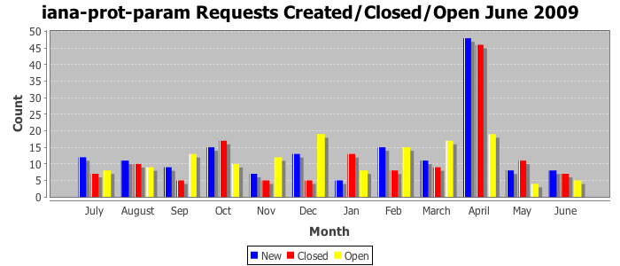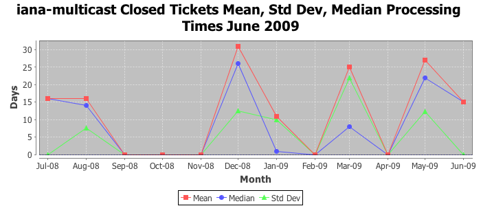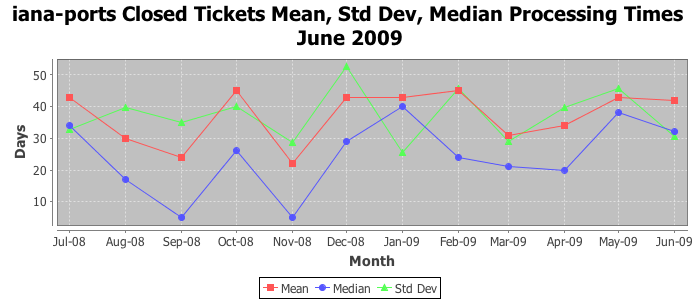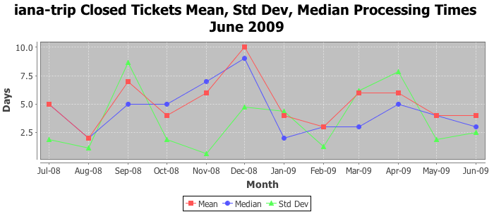 June 2009Due to the nature of resource request reviews, ICANN/IANA and the IETF community are jointly responsible for cooperatively managing the resource request process. ICANN/IANA has control over the functions it performs directly, e.g., receiving requests, making sure they are syntactically and semantically sensible, forwarding the requests to Designated Experts where appropriate, creating and modifying the registries, etc. The IETF community has direct or indirect control over functions performed by third parties, including IESG Designated Experts, the IESG, the IAB, the RFC Editor, and the requester. As such, the processing of requests has a “gross processing time” calendar days goal established for each function and a “net processing time” calendar days goal to reflect time expended directly by ICANN/IANA.