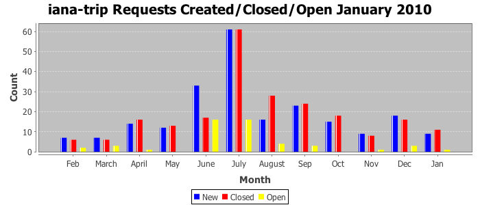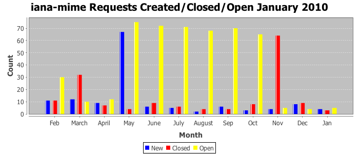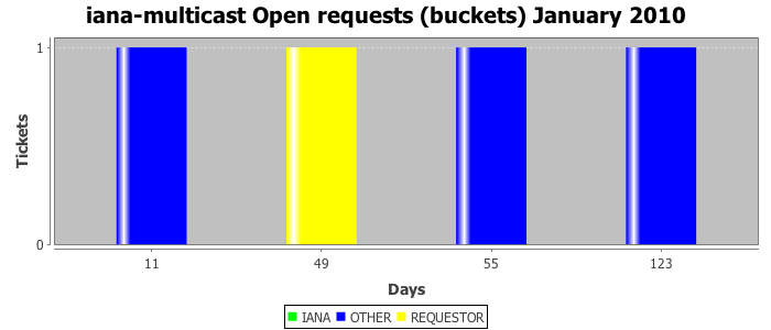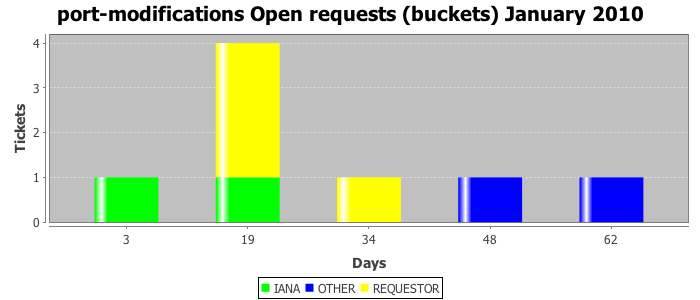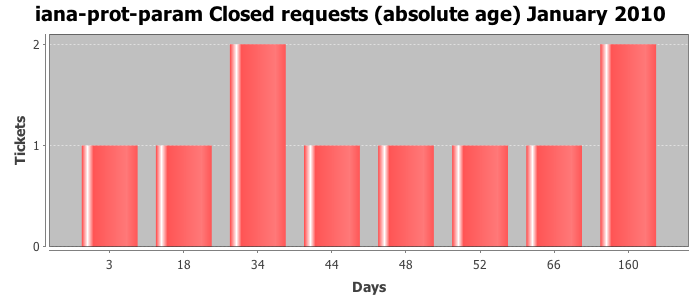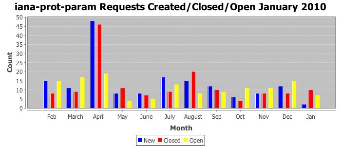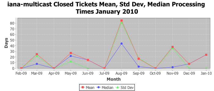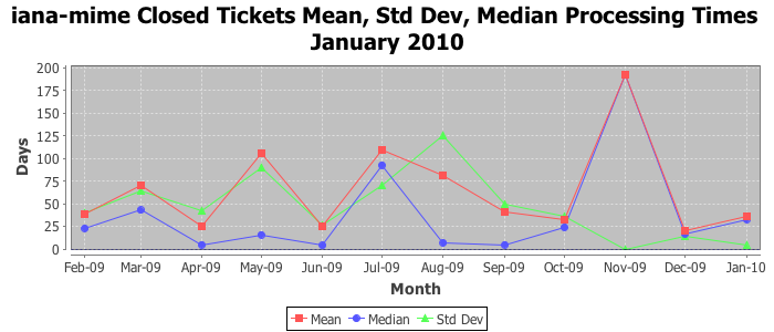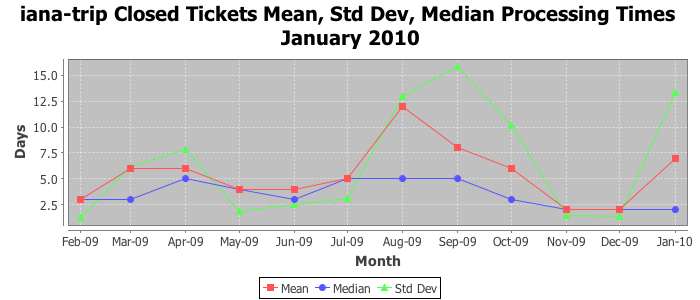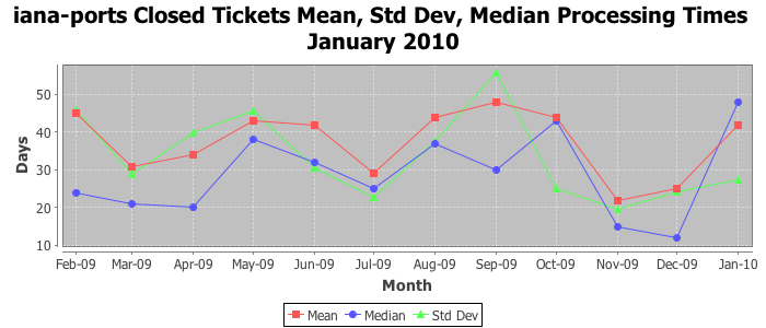 January 2010Due to the nature of resource request reviews, ICANN/IANA and the IETF community are jointly responsible for cooperatively managing the resource request process. ICANN/IANA has control over the functions it performs directly, e.g., receiving requests, making sure they are syntactically and semantically sensible, forwarding the requests to Designated Experts where appropriate, creating and modifying the registries, etc. The IETF community has direct or indirect control over functions performed by third parties, including IESG Designated Experts, the IESG, the IAB, the RFC Editor, and the requester. As such, the processing of requests has a “gross processing time” calendar days goal established for each function and a “net processing time” calendar days goal to reflect time expended directly by ICANN/IANA.