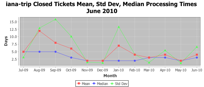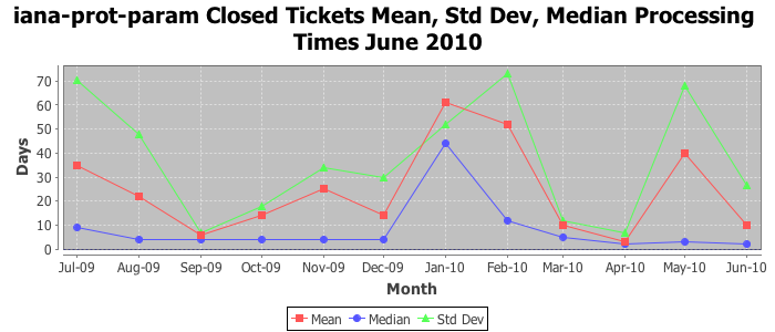 June 2010Due to the nature of resource request reviews, ICANN/IANA and the IETF community are jointly responsible for cooperatively managing the resource request process. ICANN/IANA has control over the functions it performs directly, e.g., receiving requests, making sure they are syntactically and semantically sensible, forwarding the requests to Designated Experts where appropriate, creating and modifying the registries, etc. The IETF community has direct or indirect control over functions performed by third parties, including IESG Designated Experts, the IESG, the IAB, the RFC Editor, and the requester. As such, the processing of requests has a “gross processing time” calendar days goal established for each function and a “net processing time” calendar days goal to reflect time expended directly by ICANN/IANA.
