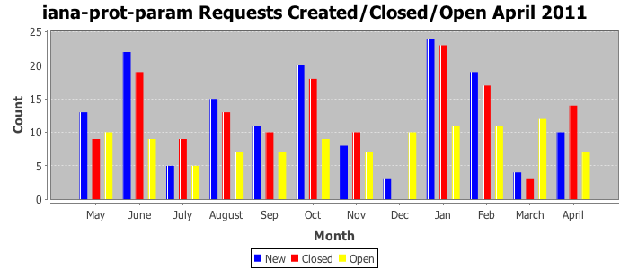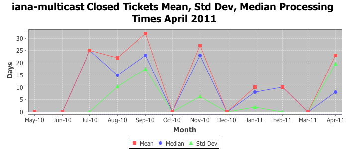 April 2011Due to the nature of resource request reviews, ICANN/IANA and the IETF community are jointly responsible for cooperatively managing the resource request process. ICANN/IANA has control over the functions it performs directly, e.g., receiving requests, making sure they are syntactically and semantically sensible, forwarding the requests to Designated Experts where appropriate, creating and modifying the registries, etc. The IETF community has direct or indirect control over functions performed by third parties, including IESG Designated Experts, the IESG, the IAB, the RFC Editor, and the requester. As such, the processing of requests has a “gross processing time” calendar days goal established for each function and a “net processing time” calendar days goal to reflect time expended directly by ICANN/IANA.