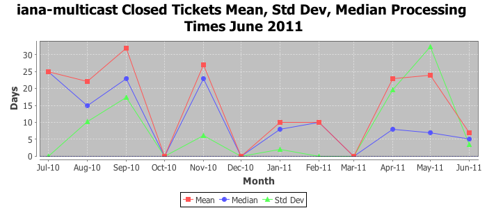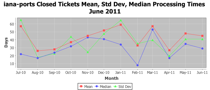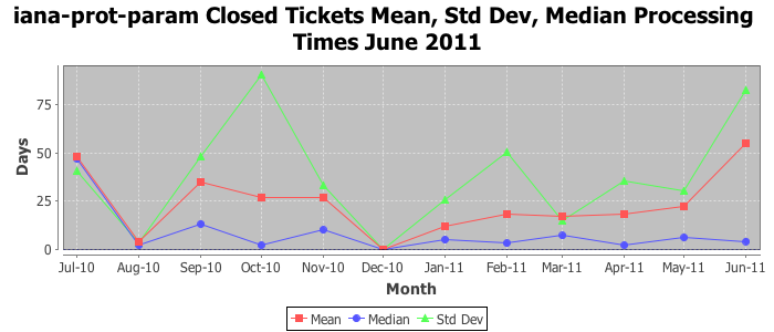 June 2011Due to the nature of resource request reviews, ICANN/IANA and the IETF community are jointly responsible for cooperatively managing the resource request process. ICANN/IANA has control over the functions it performs directly, e.g., receiving requests, making sure they are syntactically and semantically sensible, forwarding the requests to Designated Experts where appropriate, creating and modifying the registries, etc. The IETF community has direct or indirect control over functions performed by third parties, including IESG Designated Experts, the IESG, the IAB, the RFC Editor, and the requester. As such, the processing of requests has a “gross processing time” calendar days goal established for each function and a “net processing time” calendar days goal to reflect time expended directly by ICANN/IANA.