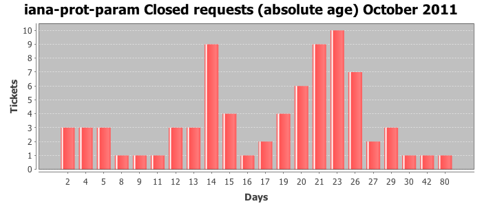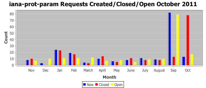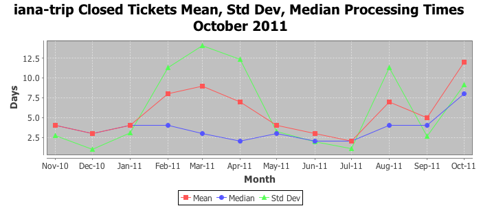 October 2011Due to the nature of resource request reviews, ICANN/IANA and the IETF community are jointly responsible for cooperatively managing the resource request process. ICANN/IANA has control over the functions it performs directly, e.g., receiving requests, making sure they are syntactically and semantically sensible, forwarding the requests to Designated Experts where appropriate, creating and modifying the registries, etc. The IETF community has direct or indirect control over functions performed by third parties, including IESG Designated Experts, the IESG, the IAB, the RFC Editor, and the requester. As such, the processing of requests has a “gross processing time” calendar days goal established for each function and a “net processing time” calendar days goal to reflect time expended directly by ICANN/IANA.