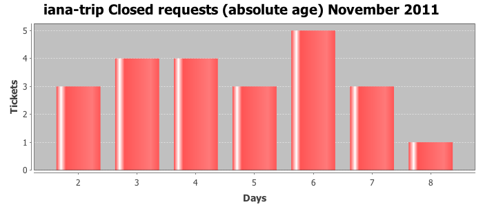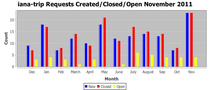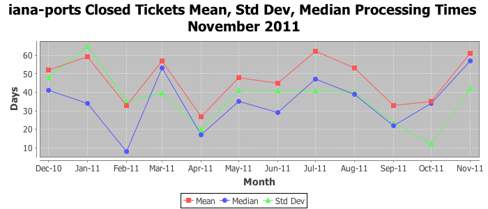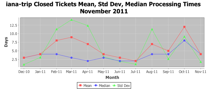 November 2011Due to the nature of resource request reviews, ICANN/IANA and the IETF community are jointly responsible for cooperatively managing the resource request process. ICANN/IANA has control over the functions it performs directly, e.g., receiving requests, making sure they are syntactically and semantically sensible, forwarding the requests to Designated Experts where appropriate, creating and modifying the registries, etc. The IETF community has direct or indirect control over functions performed by third parties, including IESG Designated Experts, the IESG, the IAB, the RFC Editor, and the requester. As such, the processing of requests has a “gross processing time” calendar days goal established for each function and a “net processing time” calendar days goal to reflect time expended directly by ICANN/IANA.