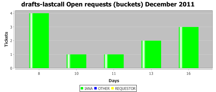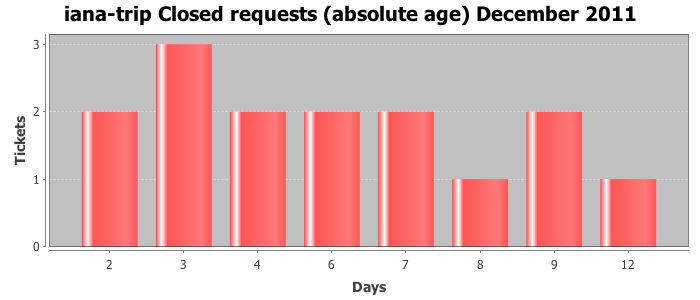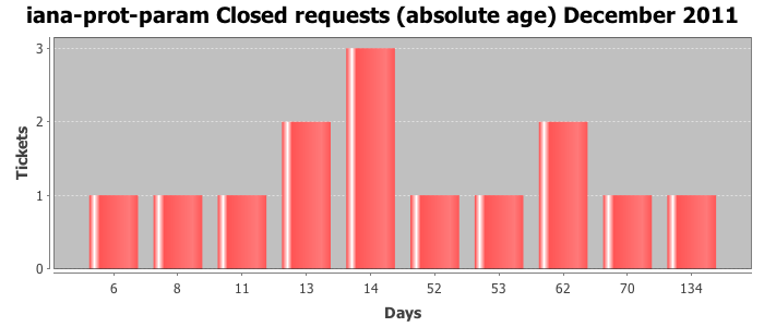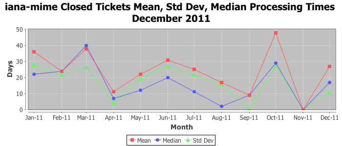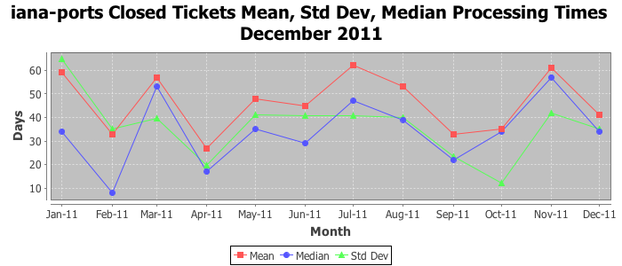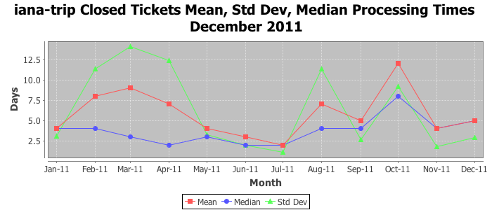 December 2011Due to the nature of resource request reviews, ICANN/IANA and the IETF community are jointly responsible for cooperatively managing the resource request process. ICANN/IANA has control over the functions it performs directly, e.g., receiving requests, making sure they are syntactically and semantically sensible, forwarding the requests to Designated Experts where appropriate, creating and modifying the registries, etc. The IETF community has direct or indirect control over functions performed by third parties, including IESG Designated Experts, the IESG, the IAB, the RFC Editor, and the requester. As such, the processing of requests has a “gross processing time” calendar days goal established for each function and a “net processing time” calendar days goal to reflect time expended directly by ICANN/IANA.