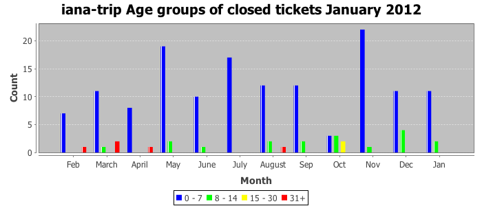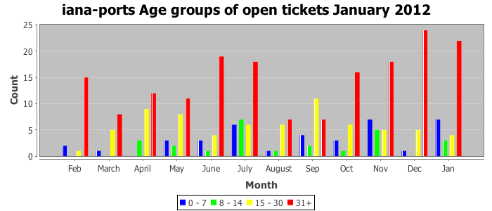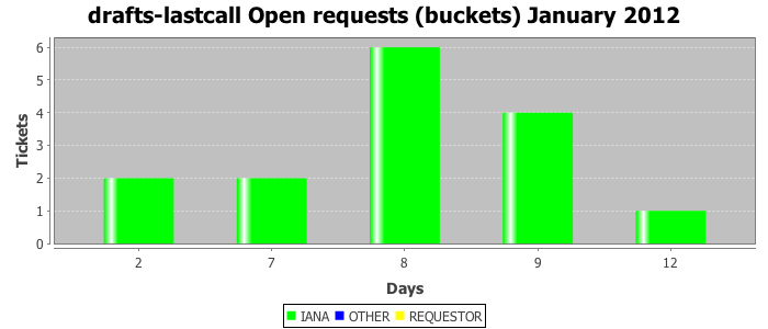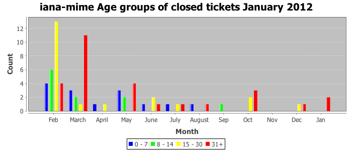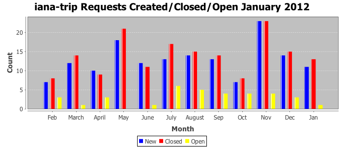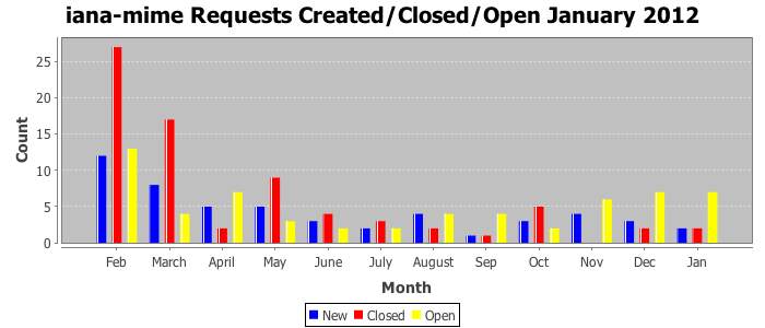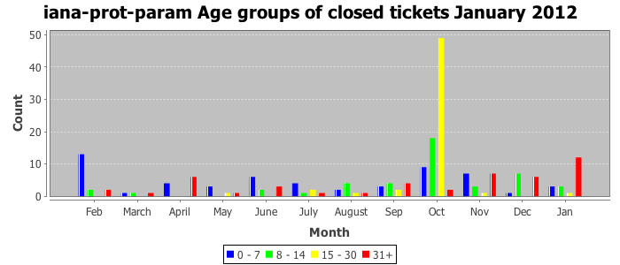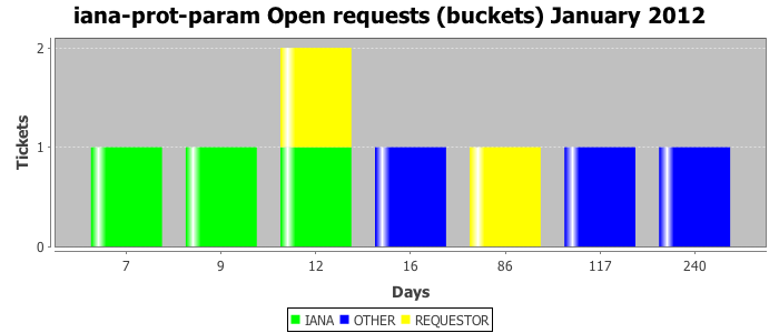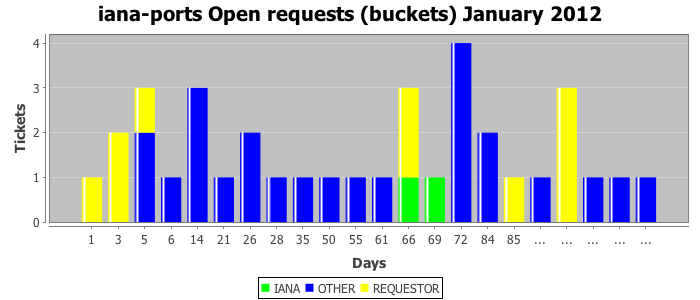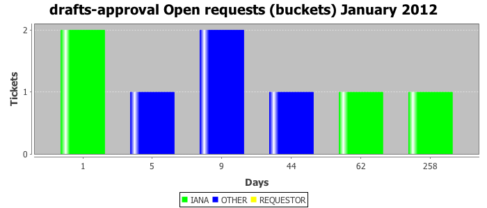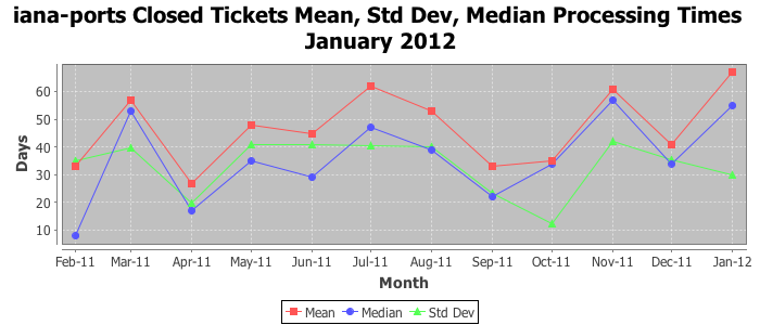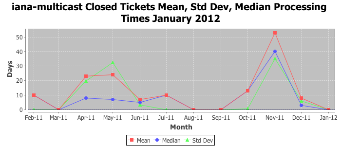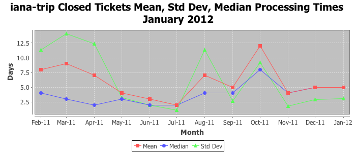 January 2012Due to the nature of resource request reviews, ICANN/IANA and the IETF community are jointly responsible for cooperatively managing the resource request process. ICANN/IANA has control over the functions it performs directly, e.g., receiving requests, making sure they are syntactically and semantically sensible, forwarding the requests to Designated Experts where appropriate, creating and modifying the registries, etc. The IETF community has direct or indirect control over functions performed by third parties, including IESG Designated Experts, the IESG, the IAB, the RFC Editor, and the requester. As such, the processing of requests has a “gross processing time” calendar days goal established for each function and a “net processing time” calendar days goal to reflect time expended directly by ICANN/IANA.