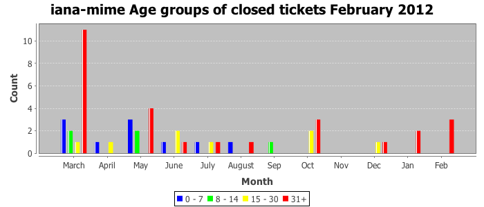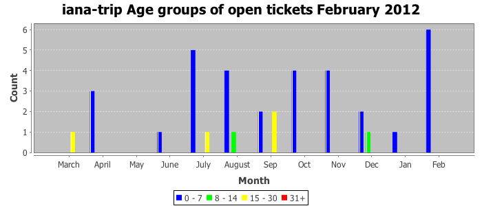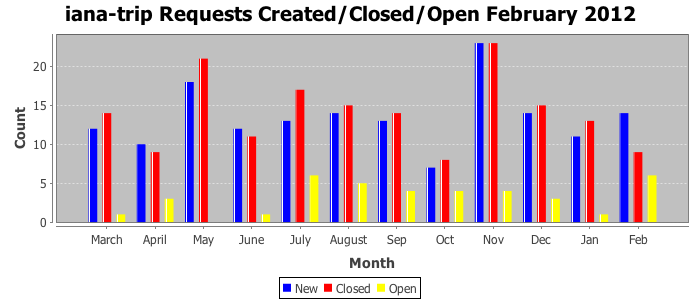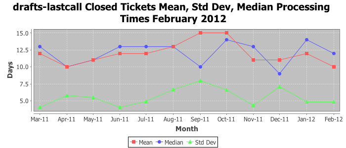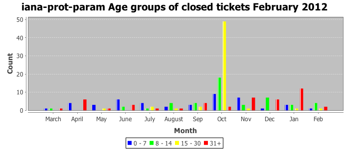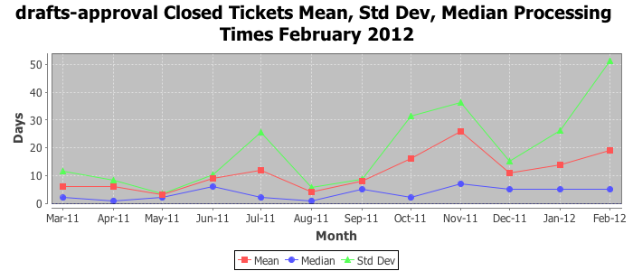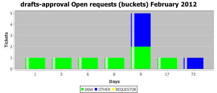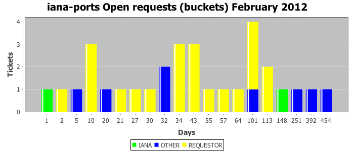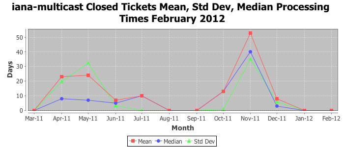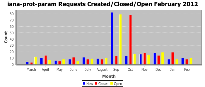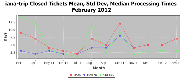 February 2012Due to the nature of resource request reviews, ICANN/IANA and the IETF community are jointly responsible for cooperatively managing the resource request process. ICANN/IANA has control over the functions it performs directly, e.g., receiving requests, making sure they are syntactically and semantically sensible, forwarding the requests to Designated Experts where appropriate, creating and modifying the registries, etc. The IETF community has direct or indirect control over functions performed by third parties, including IESG Designated Experts, the IESG, the IAB, the RFC Editor, and the requester. As such, the processing of requests has a “gross processing time” calendar days goal established for each function and a “net processing time” calendar days goal to reflect time expended directly by ICANN/IANA.