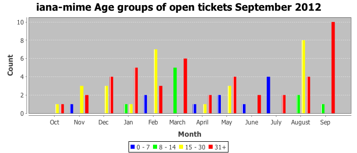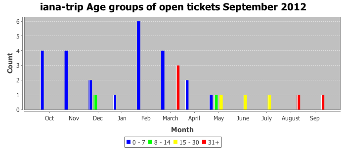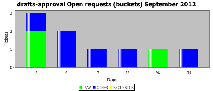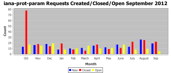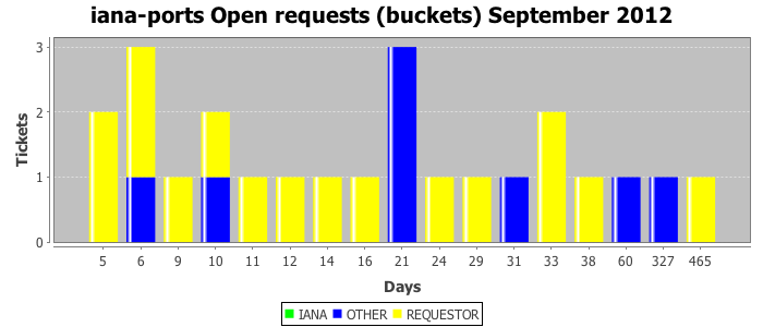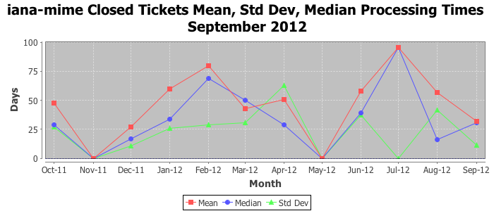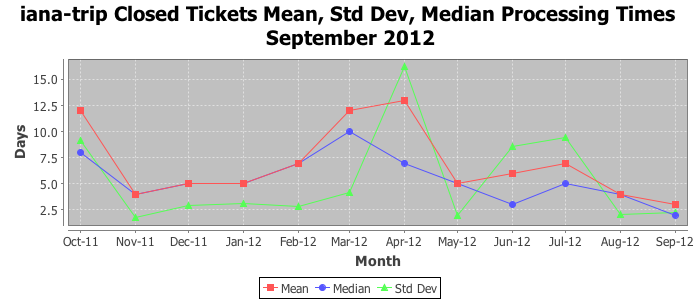September 2012Due to the nature of resource request reviews, ICANN/IANA and the IETF community are jointly responsible for cooperatively managing the resource request process. ICANN/IANA has control over the functions it performs directly, e.g., receiving requests, making sure they are syntactically and semantically sensible, forwarding the requests to Designated Experts where appropriate, creating and modifying the registries, etc. The IETF community has direct or indirect control over functions performed by third parties, including IESG Designated Experts, the IESG, the IAB, the RFC Editor, and the requester. As such, the processing of requests has a “gross processing time” calendar days goal established for each function and a “net processing time” calendar days goal to reflect time expended directly by ICANN/IANA.