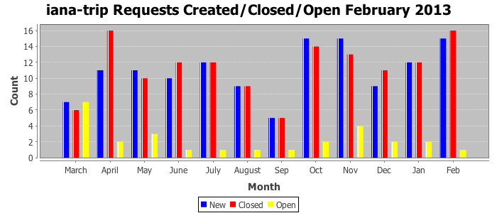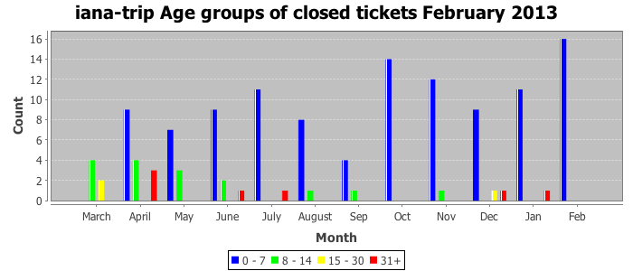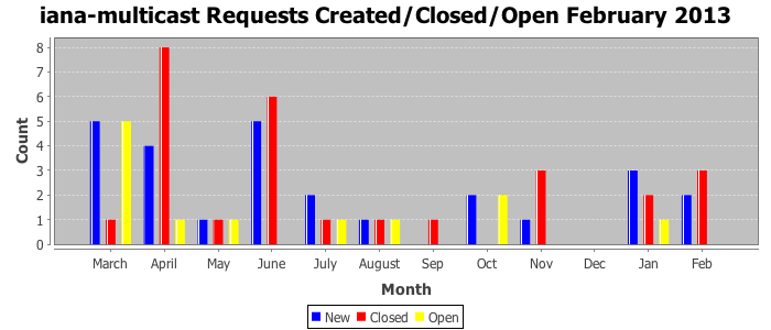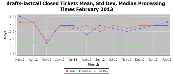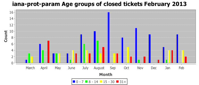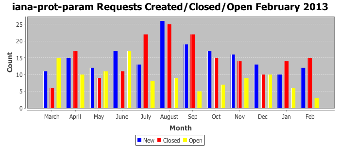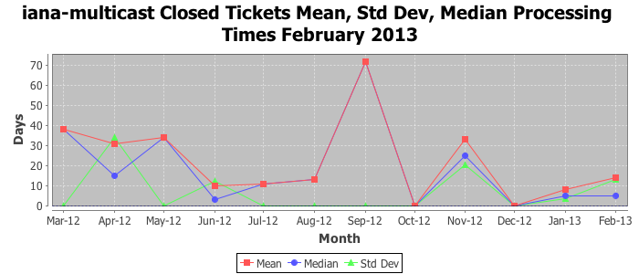 February 2013Due to the nature of resource request reviews, ICANN/IANA and the IETF community are jointly responsible for cooperatively managing the resource request process. ICANN/IANA has control over the functions it performs directly, e.g., receiving requests, making sure they are syntactically and semantically sensible, forwarding the requests to Designated Experts where appropriate, creating and modifying the registries, etc. The IETF community has direct or indirect control over functions performed by third parties, including IESG Designated Experts, the IESG, the IAB, the RFC Editor, and the requester. As such, the processing of requests has a “gross processing time” calendar days goal established for each function and a “net processing time” calendar days goal to reflect time expended directly by ICANN/IANA.