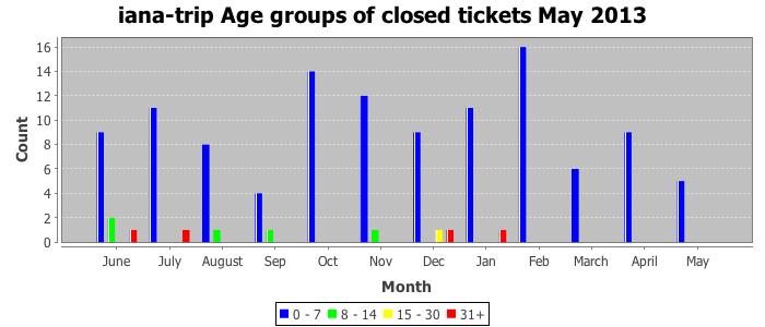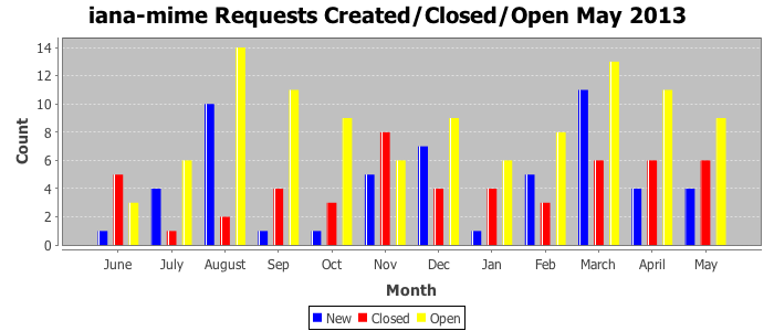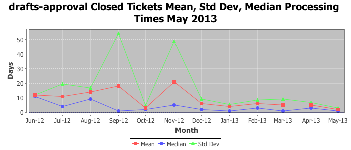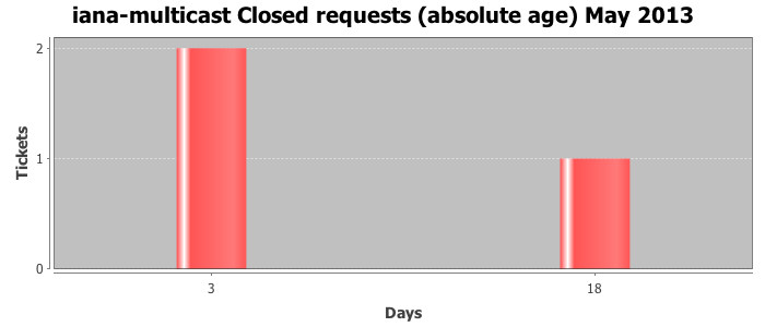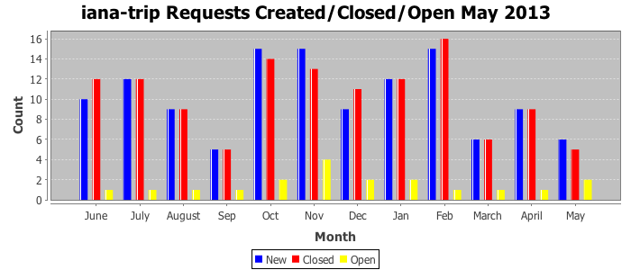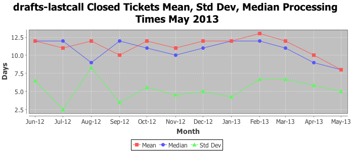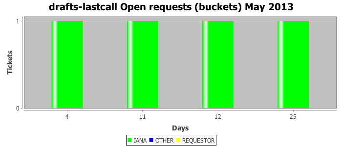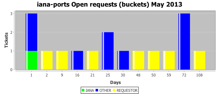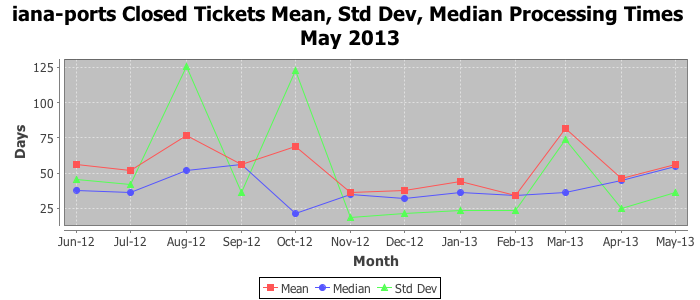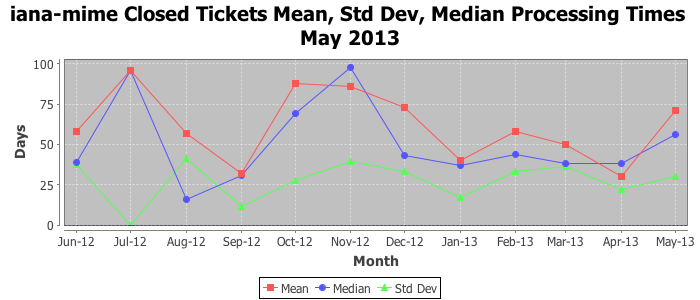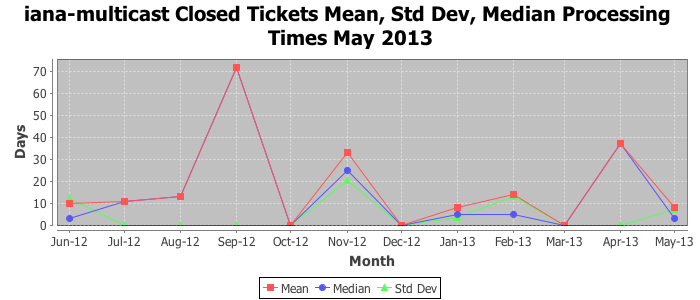 May 2013Due to the nature of resource request reviews, ICANN/IANA and the IETF community are jointly responsible for cooperatively managing the resource request process. ICANN/IANA has control over the functions it performs directly, e.g., receiving requests, making sure they are syntactically and semantically sensible, forwarding the requests to Designated Experts where appropriate, creating and modifying the registries, etc. The IETF community has direct or indirect control over functions performed by third parties, including IESG Designated Experts, the IESG, the IAB, the RFC Editor, and the requester. As such, the processing of requests has a “gross processing time” calendar days goal established for each function and a “net processing time” calendar days goal to reflect time expended directly by ICANN/IANA.
