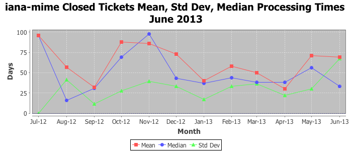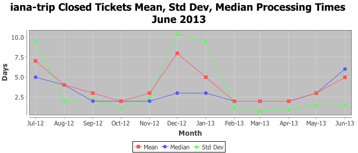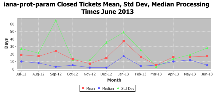 June 2013Due to the nature of resource request reviews, ICANN/IANA and the IETF community are jointly responsible for cooperatively managing the resource request process. ICANN/IANA has control over the functions it performs directly, e.g., receiving requests, making sure they are syntactically and semantically sensible, forwarding the requests to Designated Experts where appropriate, creating and modifying the registries, etc. The IETF community has direct or indirect control over functions performed by third parties, including IESG Designated Experts, the IESG, the IAB, the RFC Editor, and the requester. As such, the processing of requests has a “gross processing time” calendar days goal established for each function and a “net processing time” calendar days goal to reflect time expended directly by ICANN/IANA.