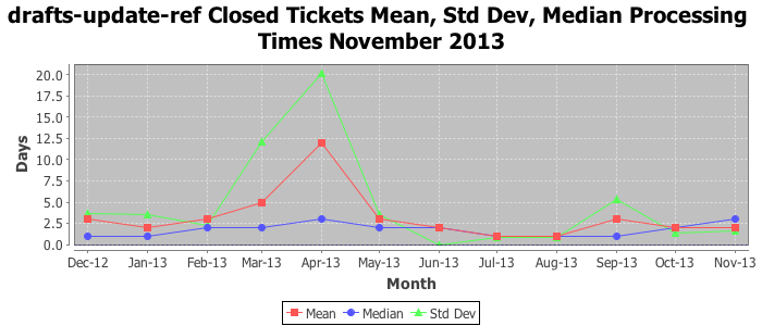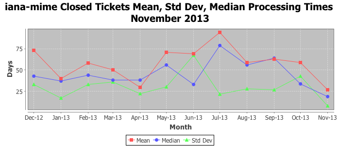 The statistics below are offered to measure IANA's fulfillment of the goals established in the ICANN / IANA - IETF MoU Supplemental Agreement. Further details on these goals and statistics can be found by reviewing the agreement.