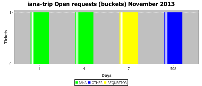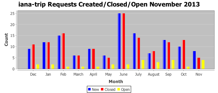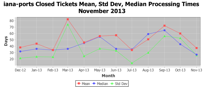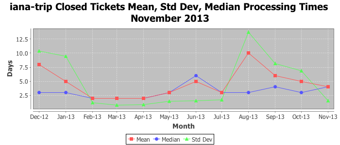 November 2013Due to the nature of resource request reviews, ICANN/IANA and the IETF community are jointly responsible for cooperatively managing the resource request process. ICANN/IANA has control over the functions it performs directly, e.g., receiving requests, making sure they are syntactically and semantically sensible, forwarding the requests to Designated Experts where appropriate, creating and modifying the registries, etc. The IETF community has direct or indirect control over functions performed by third parties, including IESG Designated Experts, the IESG, the IAB, the RFC Editor, and the requester. As such, the processing of requests has a “gross processing time” calendar days goal established for each function and a “net processing time” calendar days goal to reflect time expended directly by ICANN/IANA.