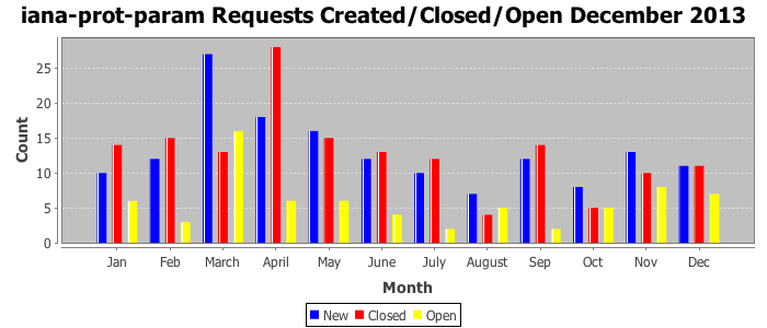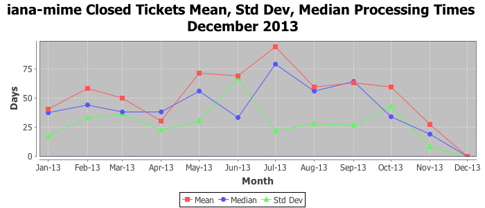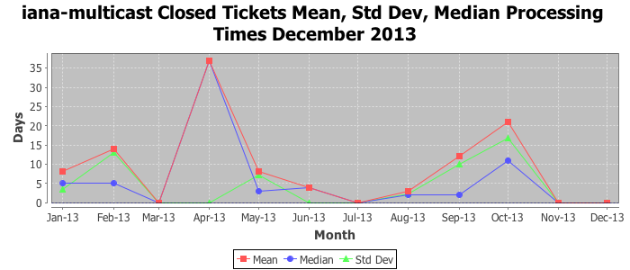 December 2013Due to the nature of resource request reviews, ICANN/IANA and the IETF community are jointly responsible for cooperatively managing the resource request process. ICANN/IANA has control over the functions it performs directly, e.g., receiving requests, making sure they are syntactically and semantically sensible, forwarding the requests to Designated Experts where appropriate, creating and modifying the registries, etc. The IETF community has direct or indirect control over functions performed by third parties, including IESG Designated Experts, the IESG, the IAB, the RFC Editor, and the requester. As such, the processing of requests has a “gross processing time” calendar days goal established for each function and a “net processing time” calendar days goal to reflect time expended directly by ICANN/IANA.