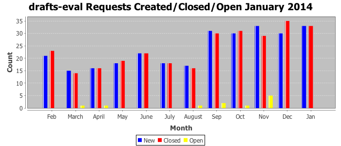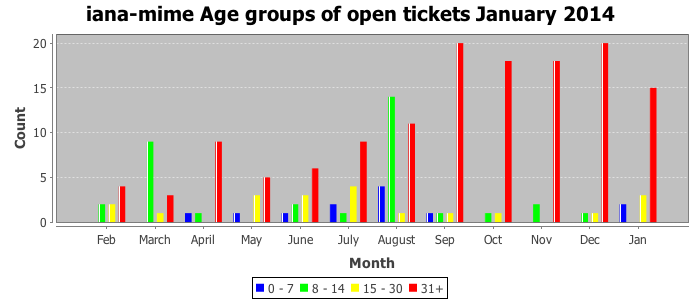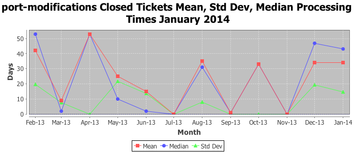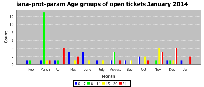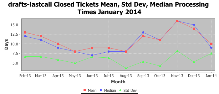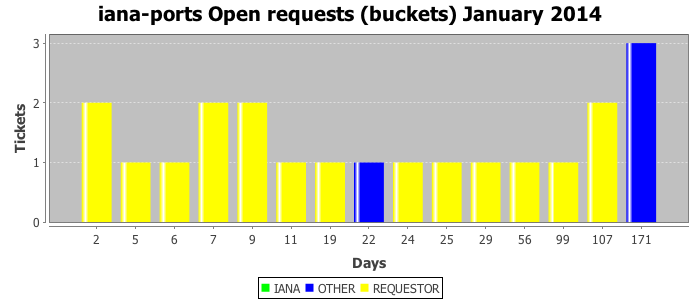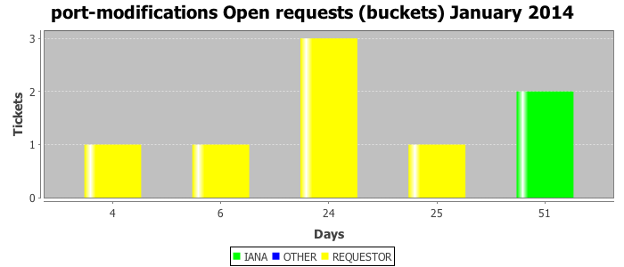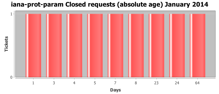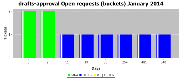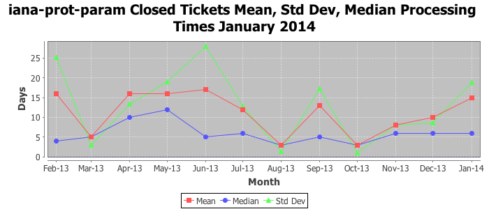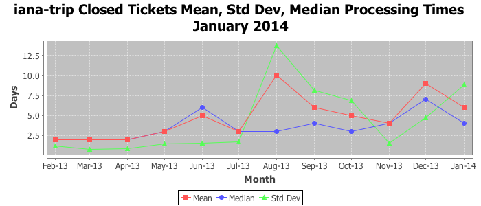 January 2014Due to the nature of resource request reviews, ICANN/IANA and the IETF community are jointly responsible for cooperatively managing the resource request process. ICANN/IANA has control over the functions it performs directly, e.g., receiving requests, making sure they are syntactically and semantically sensible, forwarding the requests to Designated Experts where appropriate, creating and modifying the registries, etc. The IETF community has direct or indirect control over functions performed by third parties, including IESG Designated Experts, the IESG, the IAB, the RFC Editor, and the requester. As such, the processing of requests has a “gross processing time” calendar days goal established for each function and a “net processing time” calendar days goal to reflect time expended directly by ICANN/IANA.