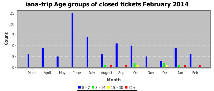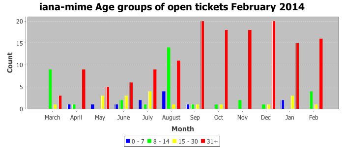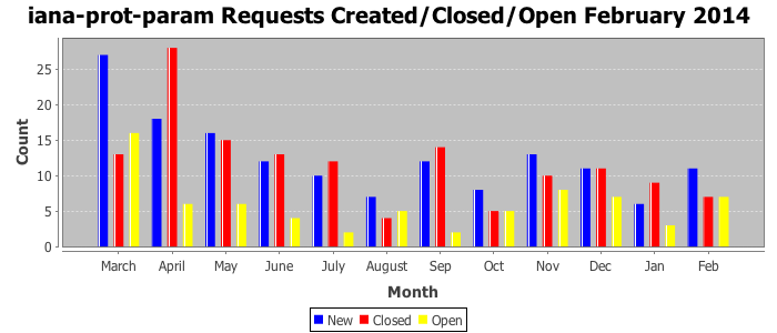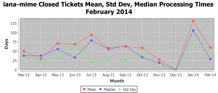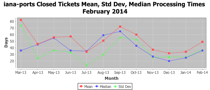 February 2014Due to the nature of resource request reviews, ICANN/IANA and the IETF community are jointly responsible for cooperatively managing the resource request process. ICANN/IANA has control over the functions it performs directly, e.g., receiving requests, making sure they are syntactically and semantically sensible, forwarding the requests to Designated Experts where appropriate, creating and modifying the registries, etc. The IETF community has direct or indirect control over functions performed by third parties, including IESG Designated Experts, the IESG, the IAB, the RFC Editor, and the requester. As such, the processing of requests has a “gross processing time” calendar days goal established for each function and a “net processing time” calendar days goal to reflect time expended directly by ICANN/IANA.