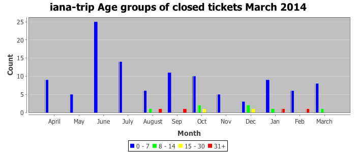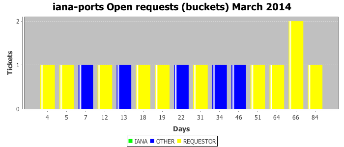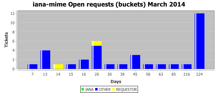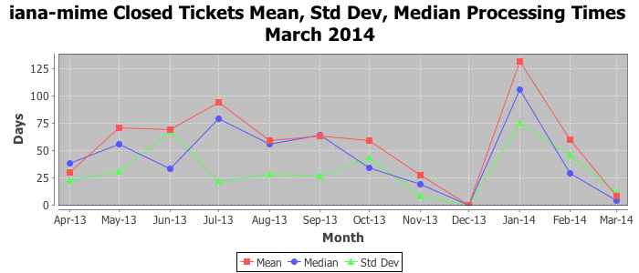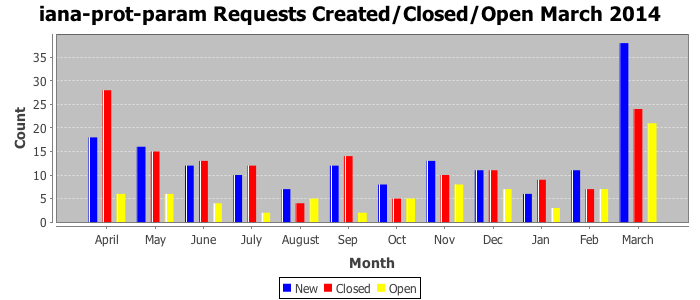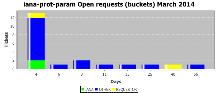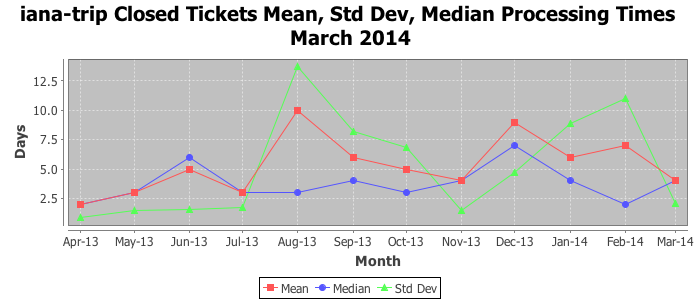 March 2014Due to the nature of resource request reviews, ICANN/IANA and the IETF community are jointly responsible for cooperatively managing the resource request process. ICANN/IANA has control over the functions it performs directly, e.g., receiving requests, making sure they are syntactically and semantically sensible, forwarding the requests to Designated Experts where appropriate, creating and modifying the registries, etc. The IETF community has direct or indirect control over functions performed by third parties, including IESG Designated Experts, the IESG, the IAB, the RFC Editor, and the requester. As such, the processing of requests has a “gross processing time” calendar days goal established for each function and a “net processing time” calendar days goal to reflect time expended directly by ICANN/IANA.