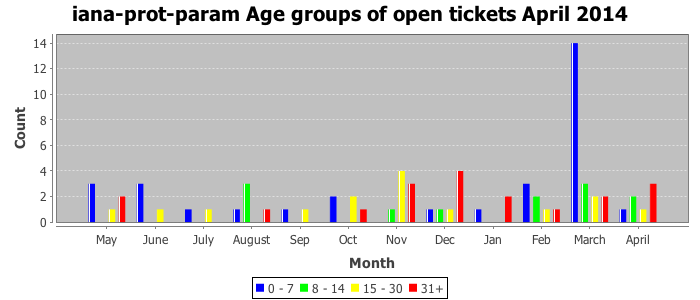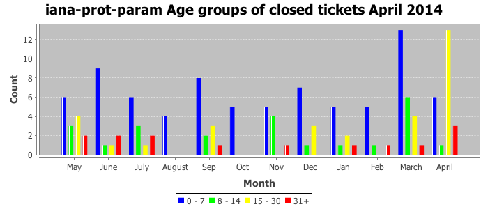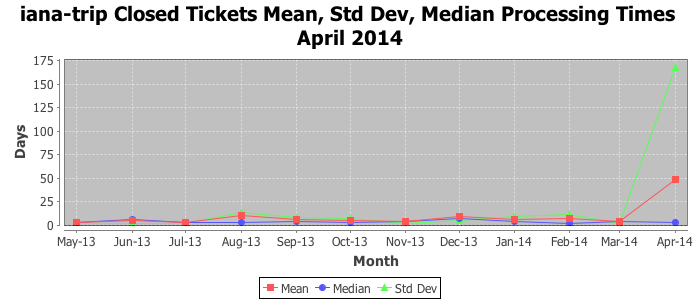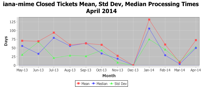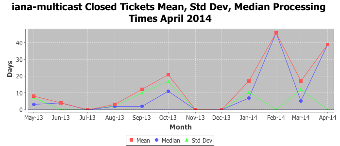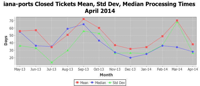 April 2014Due to the nature of resource request reviews, ICANN/IANA and the IETF community are jointly responsible for cooperatively managing the resource request process. ICANN/IANA has control over the functions it performs directly, e.g., receiving requests, making sure they are syntactically and semantically sensible, forwarding the requests to Designated Experts where appropriate, creating and modifying the registries, etc. The IETF community has direct or indirect control over functions performed by third parties, including IESG Designated Experts, the IESG, the IAB, the RFC Editor, and the requester. As such, the processing of requests has a “gross processing time” calendar days goal established for each function and a “net processing time” calendar days goal to reflect time expended directly by ICANN/IANA.