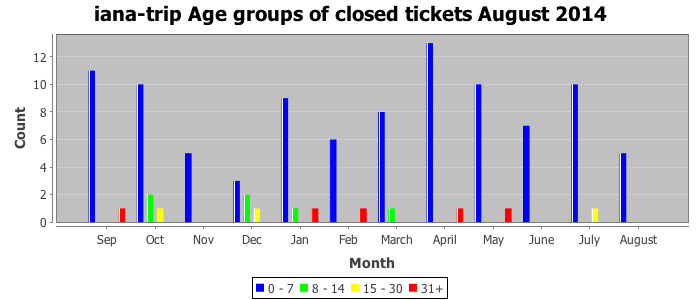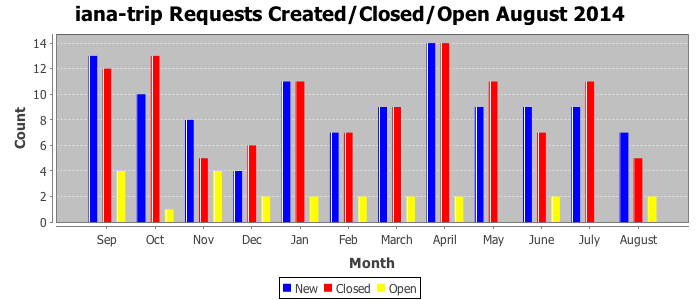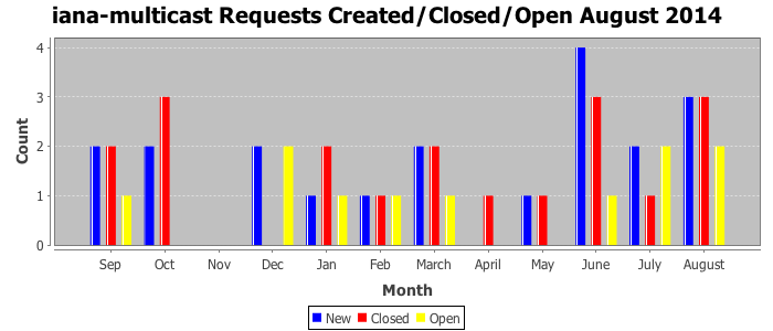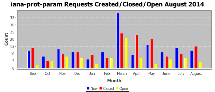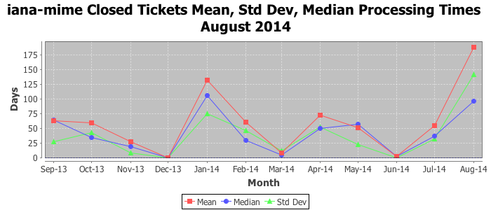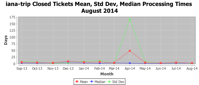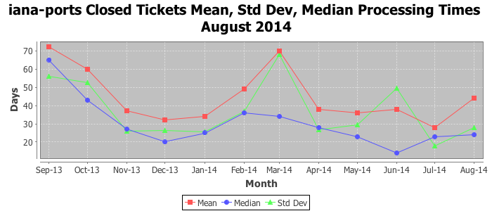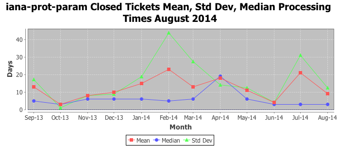 August 2014Due to the nature of resource request reviews, ICANN/IANA and the IETF community are jointly responsible for cooperatively managing the resource request process. ICANN/IANA has control over the functions it performs directly, e.g., receiving requests, making sure they are syntactically and semantically sensible, forwarding the requests to Designated Experts where appropriate, creating and modifying the registries, etc. The IETF community has direct or indirect control over functions performed by third parties, including IESG Designated Experts, the IESG, the IAB, the RFC Editor, and the requester. As such, the processing of requests has a “gross processing time” calendar days goal established for each function and a “net processing time” calendar days goal to reflect time expended directly by ICANN/IANA.