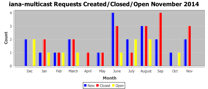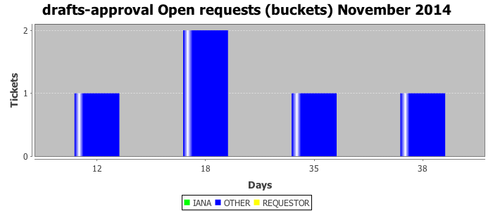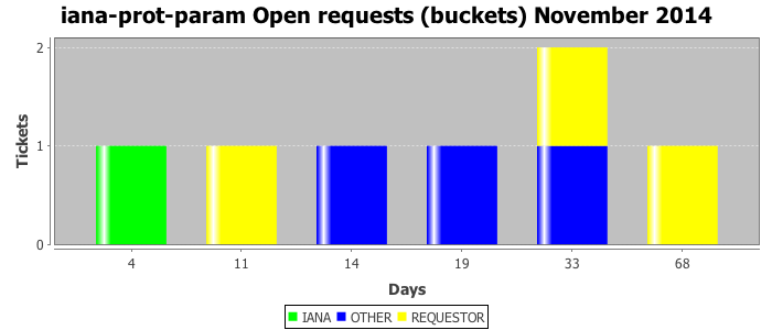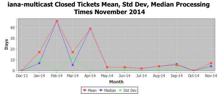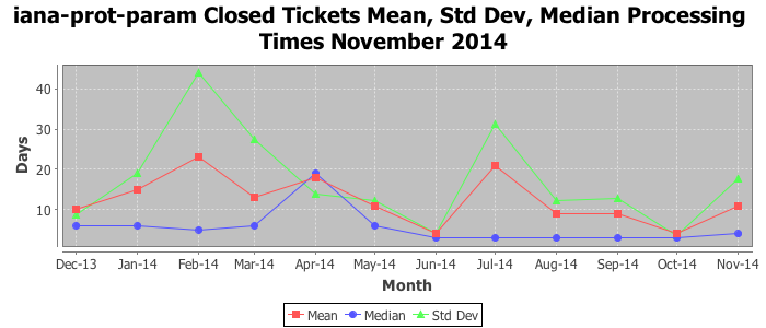 November 2014Due to the nature of resource request reviews, ICANN/IANA and the IETF community are jointly responsible for cooperatively managing the resource request process. ICANN/IANA has control over the functions it performs directly, e.g., receiving requests, making sure they are syntactically and semantically sensible, forwarding the requests to Designated Experts where appropriate, creating and modifying the registries, etc. The IETF community has direct or indirect control over functions performed by third parties, including IESG Designated Experts, the IESG, the IAB, the RFC Editor, and the requester. As such, the processing of requests has a “gross processing time” calendar days goal established for each function and a “net processing time” calendar days goal to reflect time expended directly by ICANN/IANA.