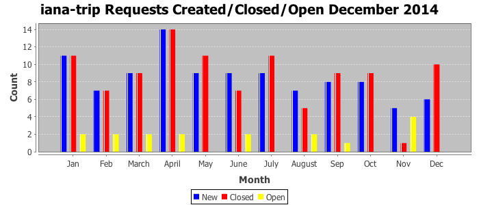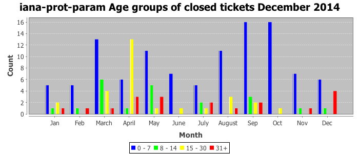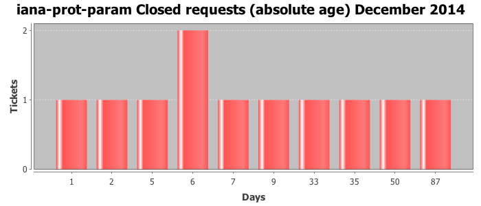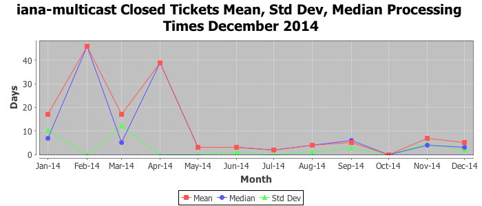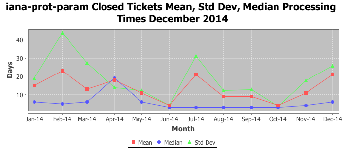December 2014Due to the nature of resource request reviews, ICANN/IANA and the IETF community are jointly responsible for cooperatively managing the resource request process. ICANN/IANA has control over the functions it performs directly, e.g., receiving requests, making sure they are syntactically and semantically sensible, forwarding the requests to Designated Experts where appropriate, creating and modifying the registries, etc. The IETF community has direct or indirect control over functions performed by third parties, including IESG Designated Experts, the IESG, the IAB, the RFC Editor, and the requester. As such, the processing of requests has a “gross processing time” calendar days goal established for each function and a “net processing time” calendar days goal to reflect time expended directly by ICANN/IANA.