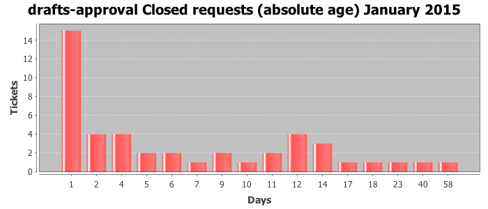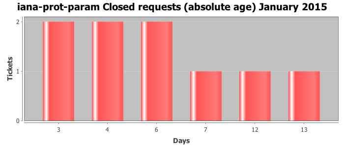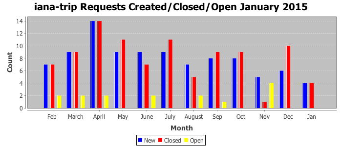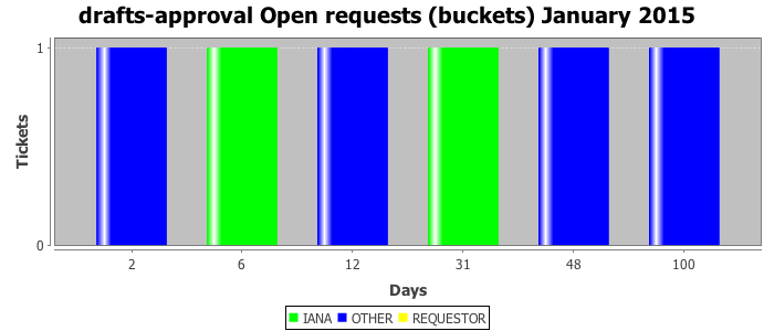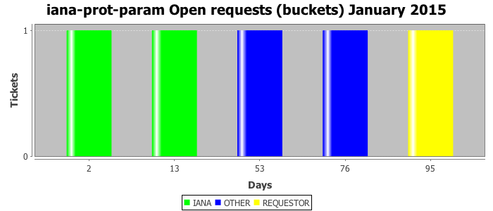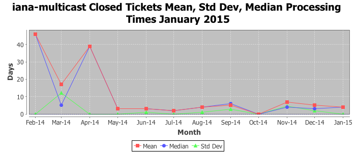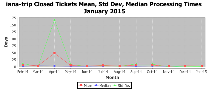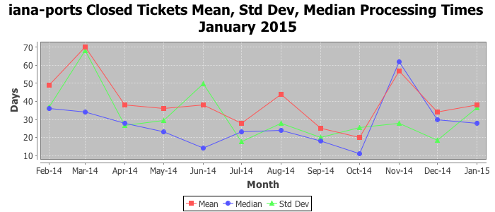 January 2015Due to the nature of resource request reviews, ICANN/IANA and the IETF community are jointly responsible for cooperatively managing the resource request process. ICANN/IANA has control over the functions it performs directly, e.g., receiving requests, making sure they are syntactically and semantically sensible, forwarding the requests to Designated Experts where appropriate, creating and modifying the registries, etc. The IETF community has direct or indirect control over functions performed by third parties, including IESG Designated Experts, the IESG, the IAB, the RFC Editor, and the requester. As such, the processing of requests has a “gross processing time” calendar days goal established for each function and a “net processing time” calendar days goal to reflect time expended directly by ICANN/IANA.