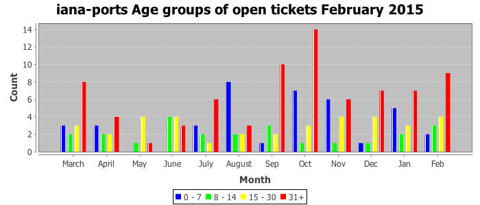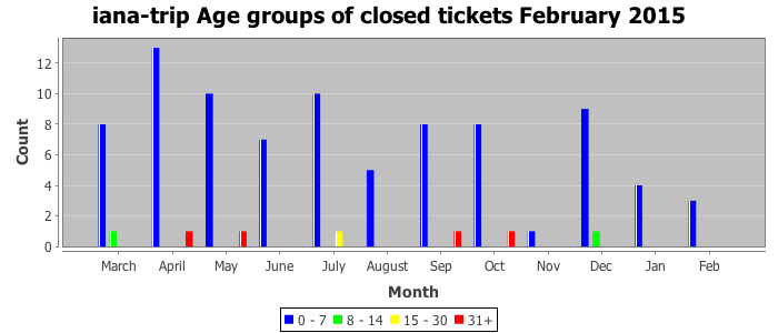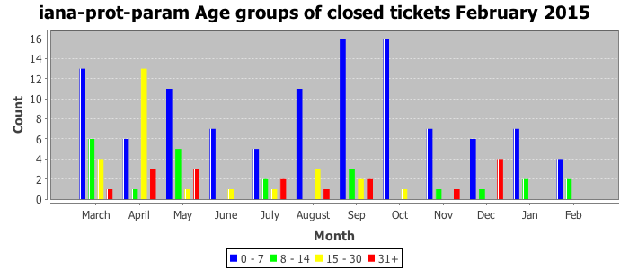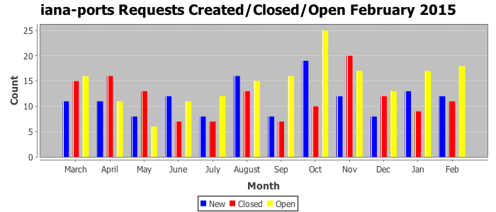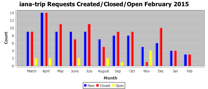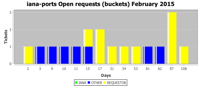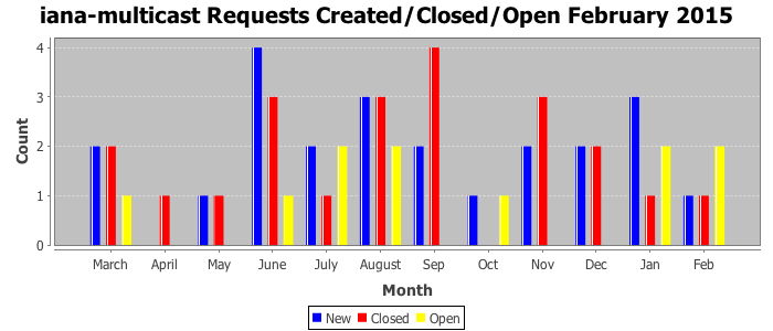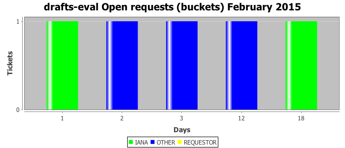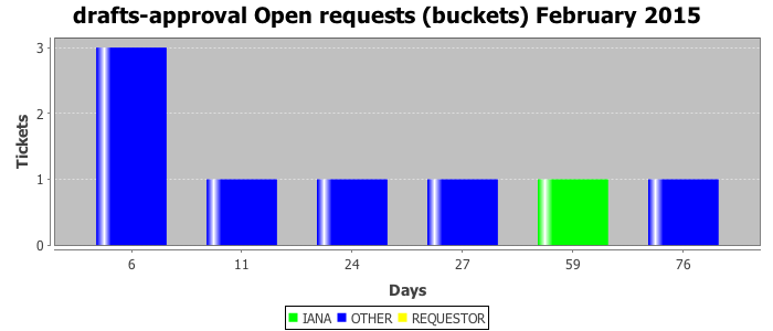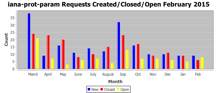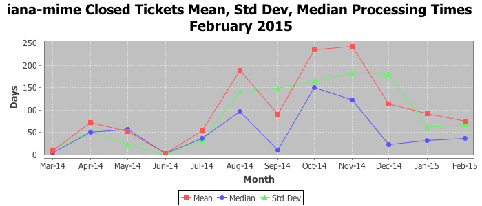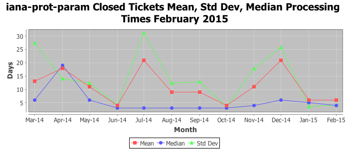 February 2015Due to the nature of resource request reviews, ICANN/IANA and the IETF community are jointly responsible for cooperatively managing the resource request process. ICANN/IANA has control over the functions it performs directly, e.g., receiving requests, making sure they are syntactically and semantically sensible, forwarding the requests to Designated Experts where appropriate, creating and modifying the registries, etc. The IETF community has direct or indirect control over functions performed by third parties, including IESG Designated Experts, the IESG, the IAB, the RFC Editor, and the requester. As such, the processing of requests has a “gross processing time” calendar days goal established for each function and a “net processing time” calendar days goal to reflect time expended directly by ICANN/IANA.