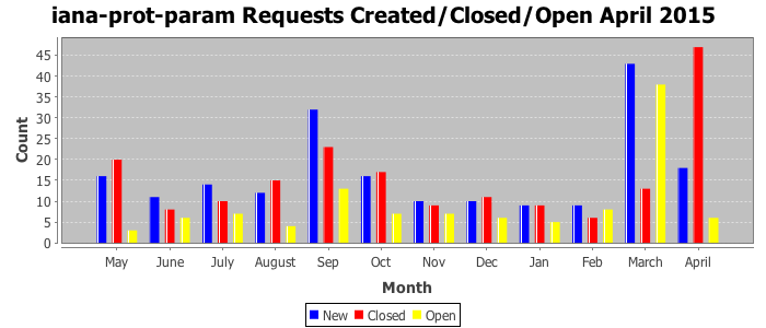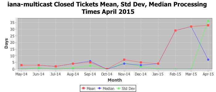 April 2015Due to the nature of resource request reviews, ICANN/IANA and the IETF community are jointly responsible for cooperatively managing the resource request process. ICANN/IANA has control over the functions it performs directly, e.g., receiving requests, making sure they are syntactically and semantically sensible, forwarding the requests to Designated Experts where appropriate, creating and modifying the registries, etc. The IETF community has direct or indirect control over functions performed by third parties, including IESG Designated Experts, the IESG, the IAB, the RFC Editor, and the requester. As such, the processing of requests has a “gross processing time” calendar days goal established for each function and a “net processing time” calendar days goal to reflect time expended directly by ICANN/IANA.