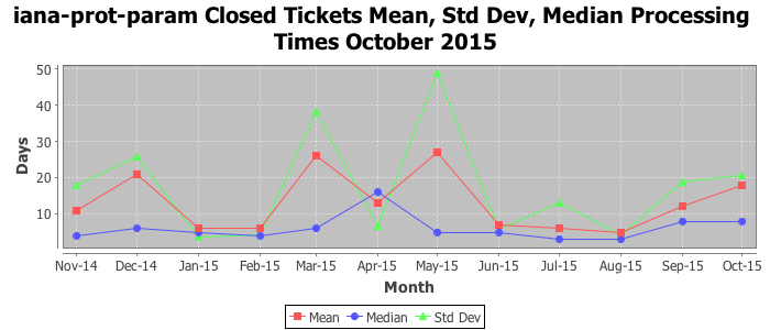 October 2015Due to the nature of resource request reviews, ICANN/IANA and the IETF community are jointly responsible for cooperatively managing the resource request process. ICANN/IANA has control over the functions it performs directly, e.g., receiving requests, making sure they are syntactically and semantically sensible, forwarding the requests to Designated Experts where appropriate, creating and modifying the registries, etc. The IETF community has direct or indirect control over functions performed by third parties, including IESG Designated Experts, the IESG, the IAB, the RFC Editor, and the requester. As such, the processing of requests has a “gross processing time” calendar days goal established for each function and a “net processing time” calendar days goal to reflect time expended directly by ICANN/IANA.