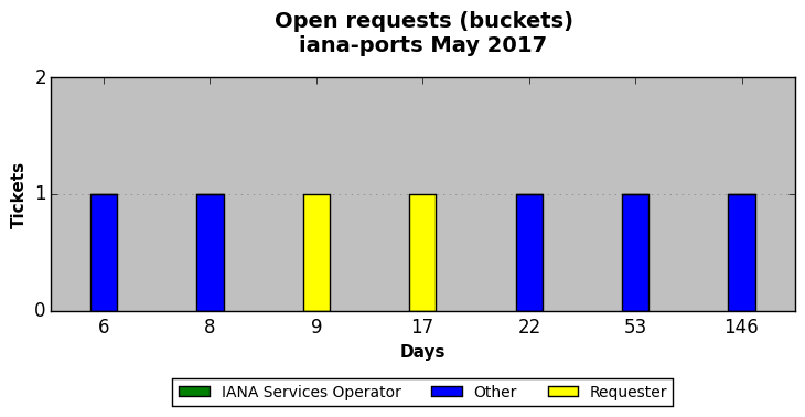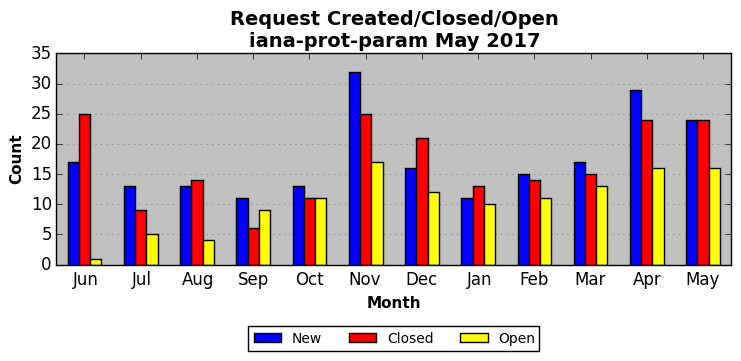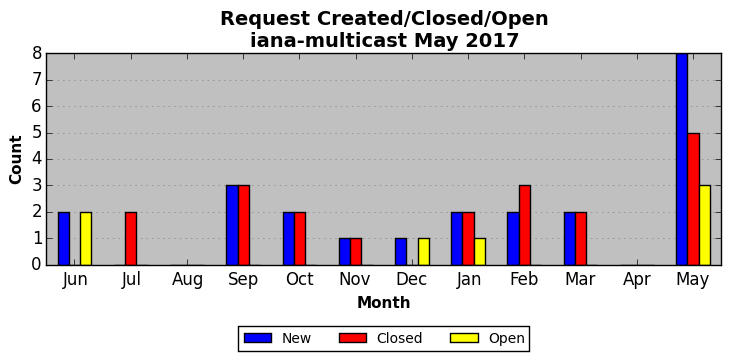 May 2017Due to the nature of resource request reviews, ICANN/IANA and the IETF community are jointly responsible for cooperatively managing the resource request process. ICANN/IANA has control over the functions it performs directly, e.g., receiving requests, making sure they are syntactically and semantically sensible, forwarding the requests to Designated Experts where appropriate, creating and modifying the registries, etc. The IETF community has direct or indirect control over functions performed by third parties, including IESG Designated Experts, the IESG, the IAB, the RFC Editor, and the requester. As such, the processing of requests has a “gross processing time” calendar days goal established for each function and a “net processing time” calendar days goal to reflect time expended directly by ICANN/IANA.