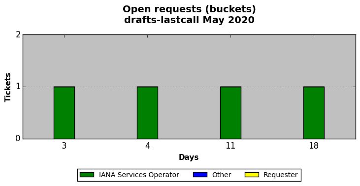 May 2020Due to the nature of resource request reviews, ICANN/IANA and the IETF community are jointly responsible for cooperatively managing the resource request process. ICANN/IANA has control over the functions it performs directly, e.g., receiving requests, making sure they are syntactically and semantically sensible, forwarding the requests to Designated Experts where appropriate, creating and modifying the registries, etc. The IETF community has direct or indirect control over functions performed by third parties, including IESG Designated Experts, the IESG, the IAB, the RFC Editor, and the requester. As such, the processing of requests has a “gross processing time” calendar days goal established for each function and a “net processing time” calendar days goal to reflect time expended directly by ICANN/IANA.