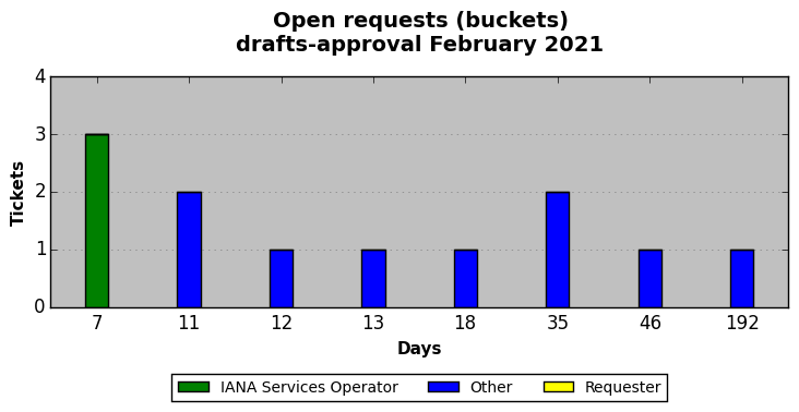 February 2021Due to the nature of resource request reviews, ICANN/IANA and the IETF community are jointly responsible for cooperatively managing the resource request process. ICANN/IANA has control over the functions it performs directly, e.g., receiving requests, making sure they are syntactically and semantically sensible, forwarding the requests to Designated Experts where appropriate, creating and modifying the registries, etc. The IETF community has direct or indirect control over functions performed by third parties, including IESG Designated Experts, the IESG, the IAB, the RFC Editor, and the requester. As such, the processing of requests has a “gross processing time” calendar days goal established for each function and a “net processing time” calendar days goal to reflect time expended directly by ICANN/IANA.