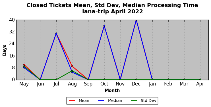 April 2022Due to the nature of resource request reviews, ICANN/IANA and the IETF community are jointly responsible for cooperatively managing the resource request process. ICANN/IANA has control over the functions it performs directly, e.g., receiving requests, making sure they are syntactically and semantically sensible, forwarding the requests to Designated Experts where appropriate, creating and modifying the registries, etc. The IETF community has direct or indirect control over functions performed by third parties, including IESG Designated Experts, the IESG, the IAB, the RFC Editor, and the requester. As such, the processing of requests has a “gross processing time” calendar days goal established for each function and a “net processing time” calendar days goal to reflect time expended directly by ICANN/IANA.