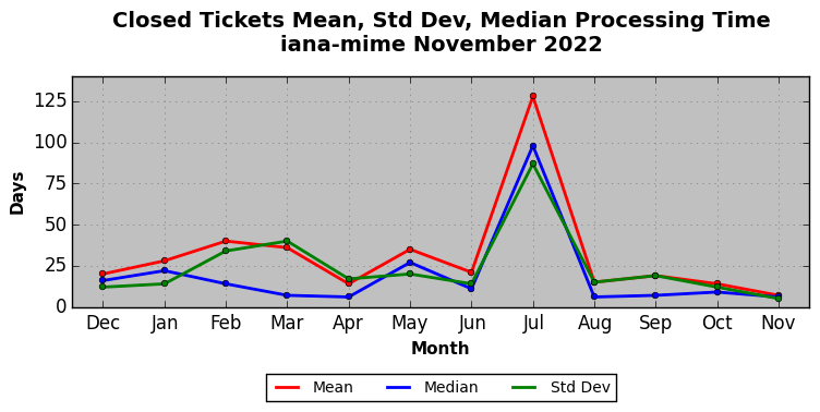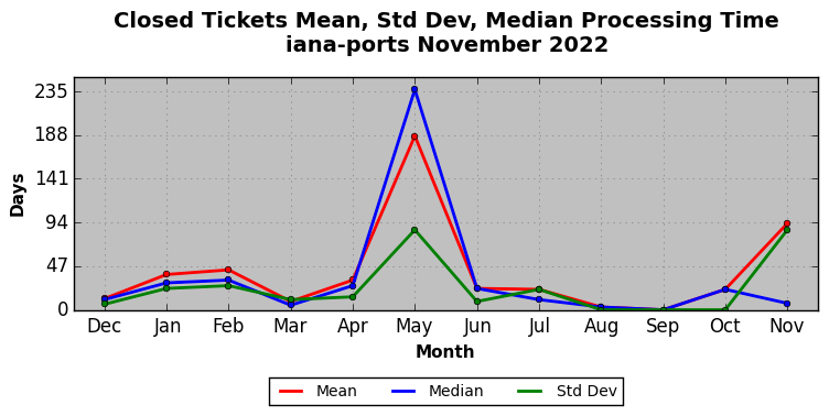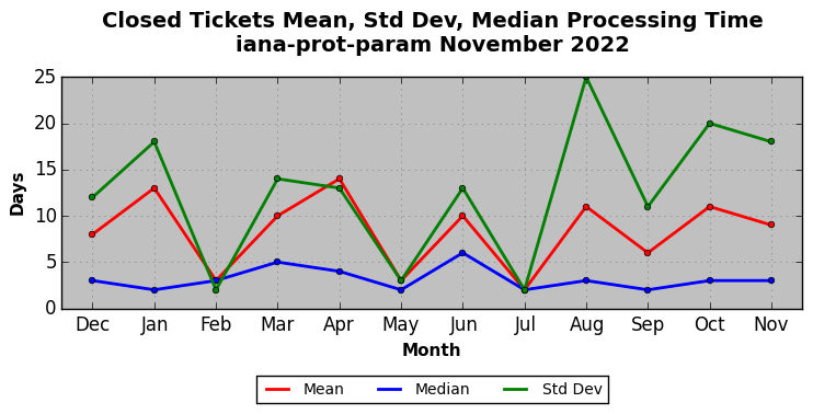 The statistics below are offered to measure IANA's fulfillment of the goals established in the ICANN / IANA - IETF MoU Supplemental Agreement. Further details on these goals and statistics can be found by reviewing the agreement.