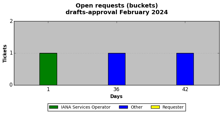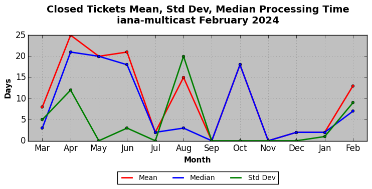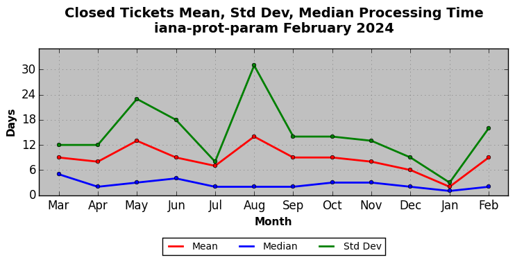 February 2024Due to the nature of resource request reviews, ICANN/IANA and the IETF community are jointly responsible for cooperatively managing the resource request process. ICANN/IANA has control over the functions it performs directly, e.g., receiving requests, making sure they are syntactically and semantically sensible, forwarding the requests to Designated Experts where appropriate, creating and modifying the registries, etc. The IETF community has direct or indirect control over functions performed by third parties, including IESG Designated Experts, the IESG, the IAB, the RFC Editor, and the requester. As such, the processing of requests has a “gross processing time” calendar days goal established for each function and a “net processing time” calendar days goal to reflect time expended directly by ICANN/IANA.
