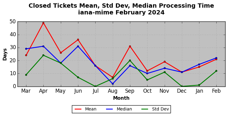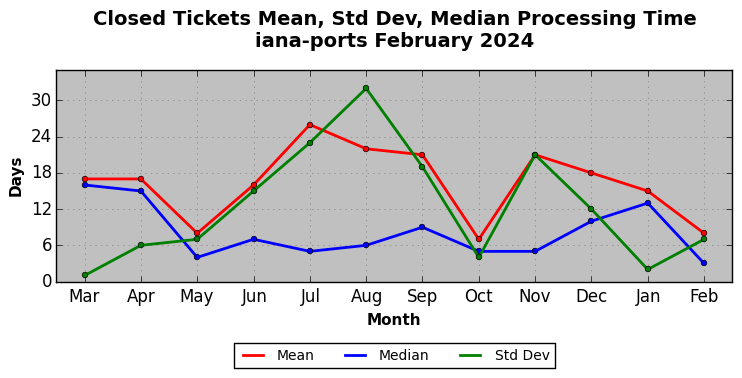 The statistics below are offered to measure IANA's fulfillment of the goals established in the ICANN / IANA - IETF MoU Supplemental Agreement. Further details on these goals and statistics can be found by reviewing the agreement.