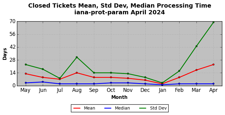 April 2024Due to the nature of resource request reviews, ICANN/IANA and the IETF community are jointly responsible for cooperatively managing the resource request process. ICANN/IANA has control over the functions it performs directly, e.g., receiving requests, making sure they are syntactically and semantically sensible, forwarding the requests to Designated Experts where appropriate, creating and modifying the registries, etc. The IETF community has direct or indirect control over functions performed by third parties, including IESG Designated Experts, the IESG, the IAB, the RFC Editor, and the requester. As such, the processing of requests has a “gross processing time” calendar days goal established for each function and a “net processing time” calendar days goal to reflect time expended directly by ICANN/IANA.
