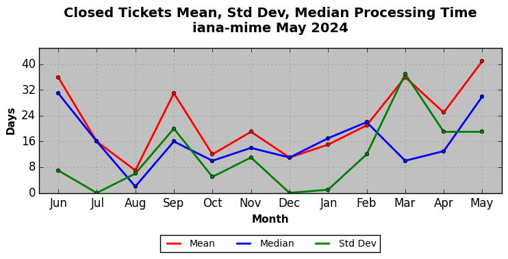 The statistics below are offered to measure IANA's fulfillment of the goals established in the ICANN / IANA - IETF MoU Supplemental Agreement. Further details on these goals and statistics can be found by reviewing the agreement.