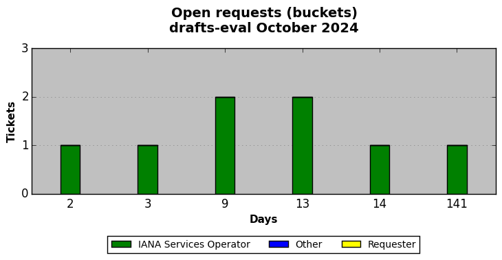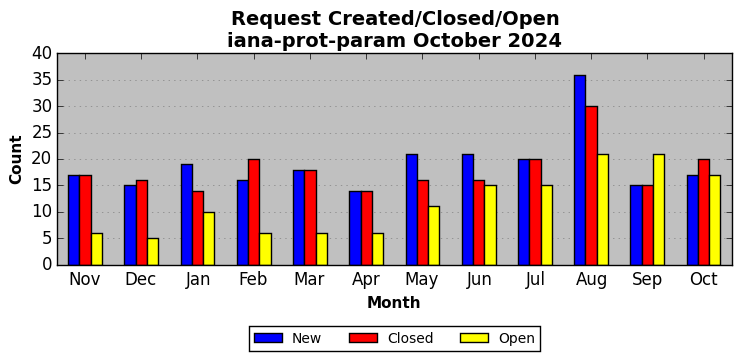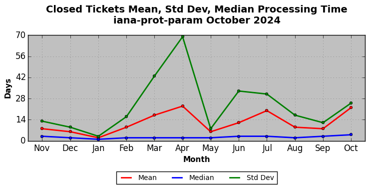 October 2024Due to the nature of resource request reviews, ICANN/IANA and the IETF community are jointly responsible for cooperatively managing the resource request process. ICANN/IANA has control over the functions it performs directly, e.g., receiving requests, making sure they are syntactically and semantically sensible, forwarding the requests to Designated Experts where appropriate, creating and modifying the registries, etc. The IETF community has direct or indirect control over functions performed by third parties, including IESG Designated Experts, the IESG, the IAB, the RFC Editor, and the requester. As such, the processing of requests has a “gross processing time” calendar days goal established for each function and a “net processing time” calendar days goal to reflect time expended directly by ICANN/IANA.
