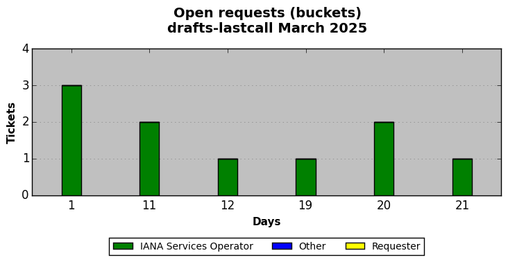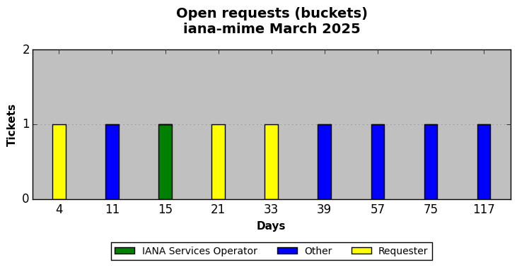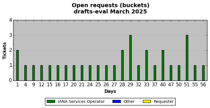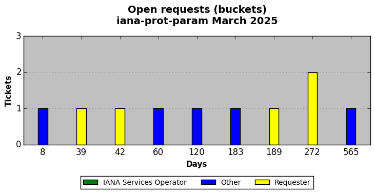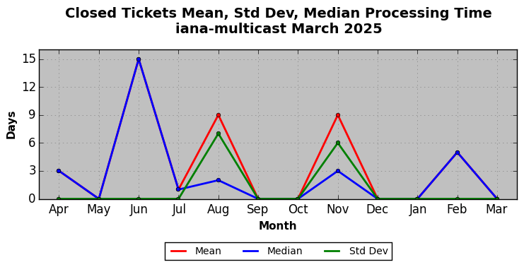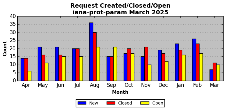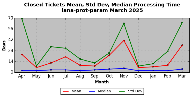 March 2025Due to the nature of resource request reviews, ICANN/IANA and the IETF community are jointly responsible for cooperatively managing the resource request process. ICANN/IANA has control over the functions it performs directly, e.g., receiving requests, making sure they are syntactically and semantically sensible, forwarding the requests to Designated Experts where appropriate, creating and modifying the registries, etc. The IETF community has direct or indirect control over functions performed by third parties, including IESG Designated Experts, the IESG, the IAB, the RFC Editor, and the requester. As such, the processing of requests has a “gross processing time” calendar days goal established for each function and a “net processing time” calendar days goal to reflect time expended directly by ICANN/IANA.