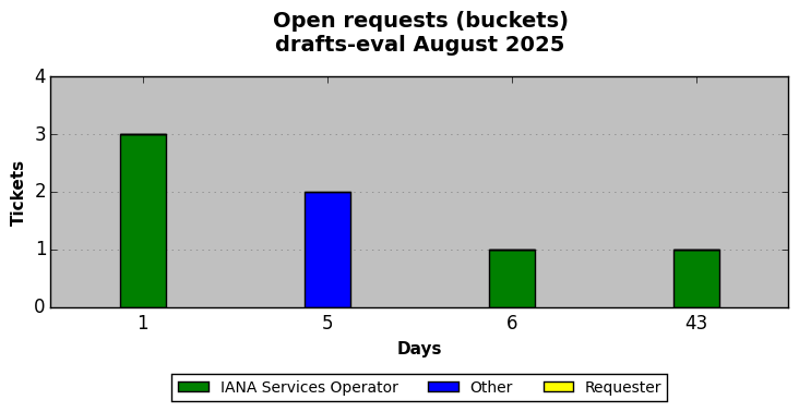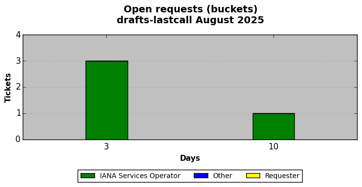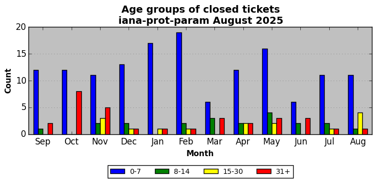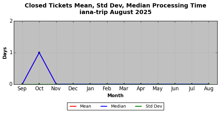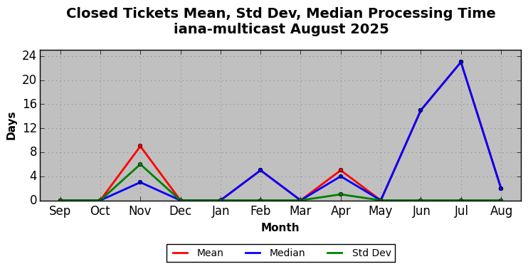 August 2025Due to the nature of resource request reviews, ICANN/IANA and the IETF community are jointly responsible for cooperatively managing the resource request process. ICANN/IANA has control over the functions it performs directly, e.g., receiving requests, making sure they are syntactically and semantically sensible, forwarding the requests to Designated Experts where appropriate, creating and modifying the registries, etc. The IETF community has direct or indirect control over functions performed by third parties, including IESG Designated Experts, the IESG, the IAB, the RFC Editor, and the requester. As such, the processing of requests has a “gross processing time” calendar days goal established for each function and a “net processing time” calendar days goal to reflect time expended directly by ICANN/IANA.